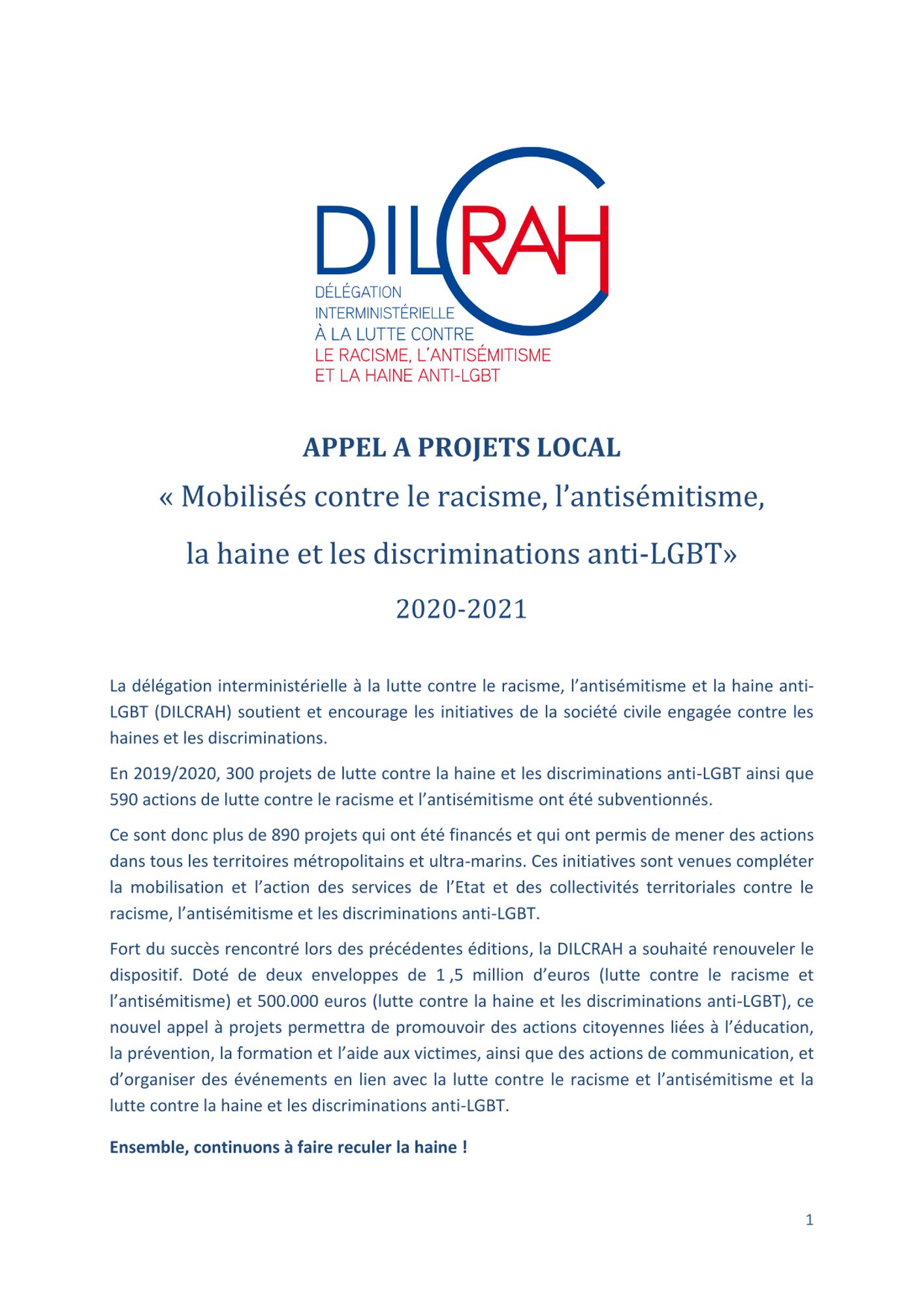 La délégation interministérielle à la lutte contre le racisme, l’antisémitisme et la haine anti- LGBT (DILCRAH) soutient et encourage les initiatives de la société civile engagée contre les haines et les discriminations. En 2019/2020, ce sont plus de 890 projets qui ont été financés et qui ont permis de mener des actions dans tous les territoires métropolitains et ultra-marins. Ces initiatives viennent compléter la mobilisation et l’action des services de l’État et des collectivités territoriales contre le racisme, l’antisémitisme et les discriminations anti-LGBT.