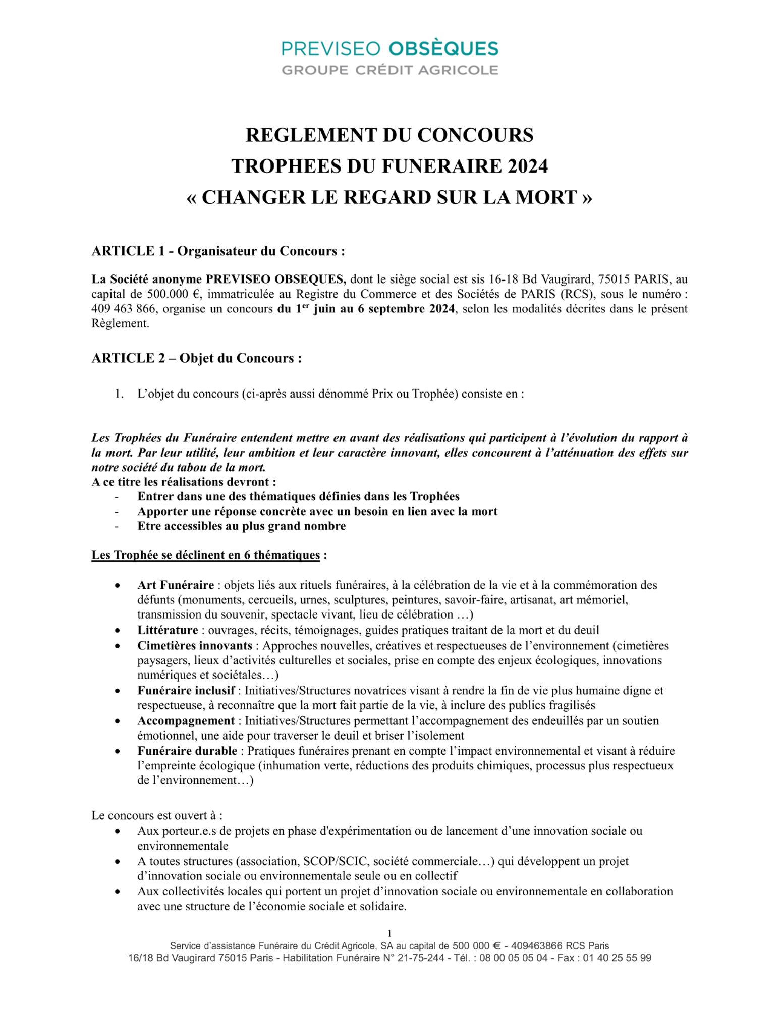 Lancé en 2019 par Préviséo Obsèques filiale d'assistance funéraire du Crédit agricole, les Trophées du funéraire visent à valoriser les initiatives positives dans le domaine de la fin de vie et des services funéraires. Toutes les actions soutenues visent à améliorer l'accompagnement des familles endeuillées sur le territoire français.