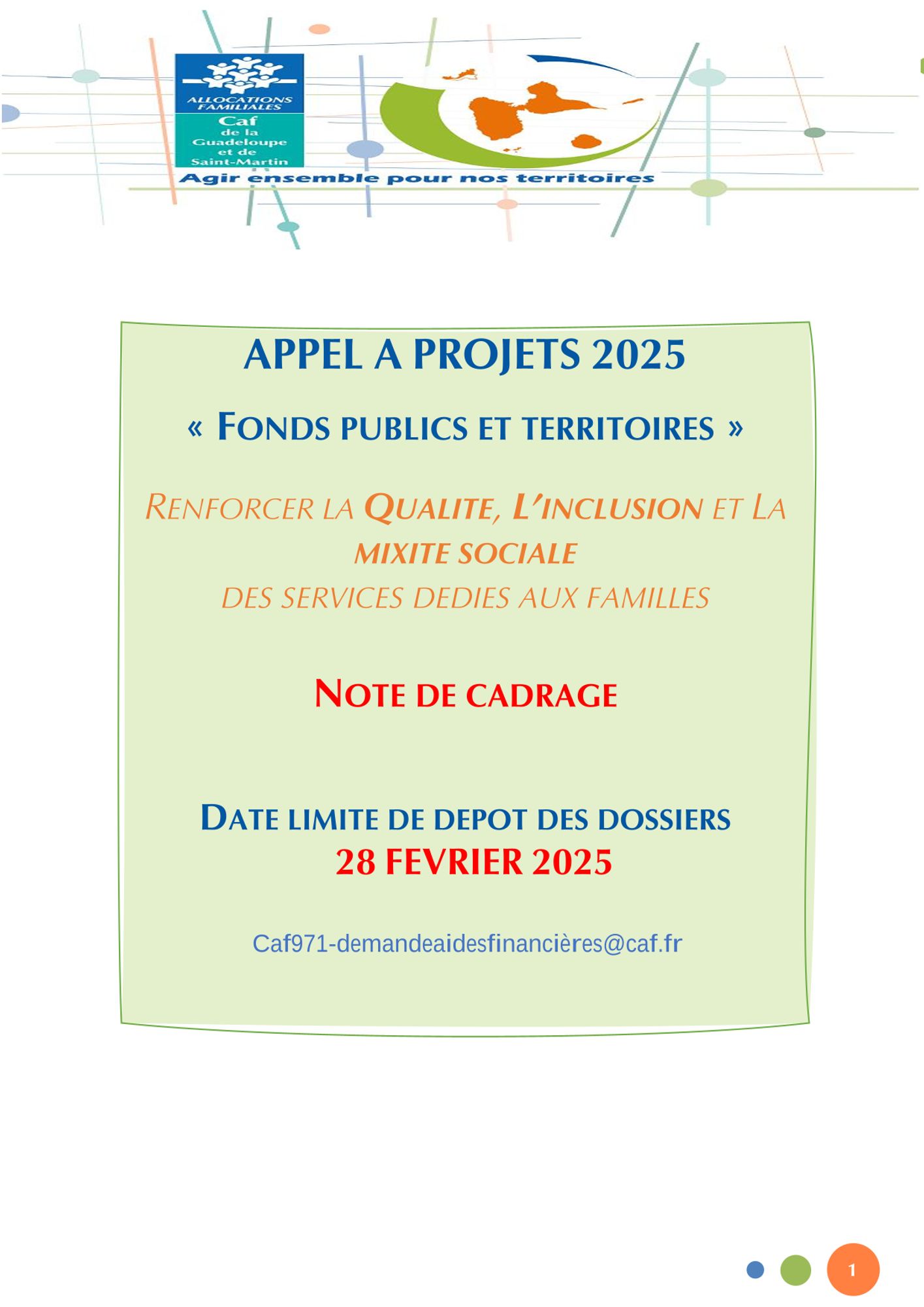 Pour plus de détails, consulter les fiches thématiques de l'AAP FPT 2025 en ligne sur le site de la CAF Guadeloupe et Saint-Martin...