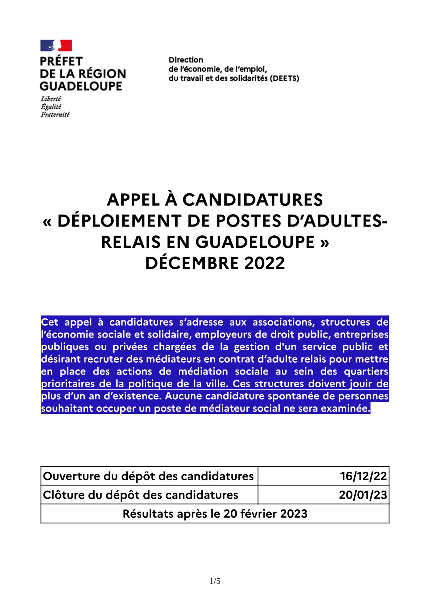 Appel à candidatures "Déploiement de postes d'adultes-relais en Guadeloupe"
