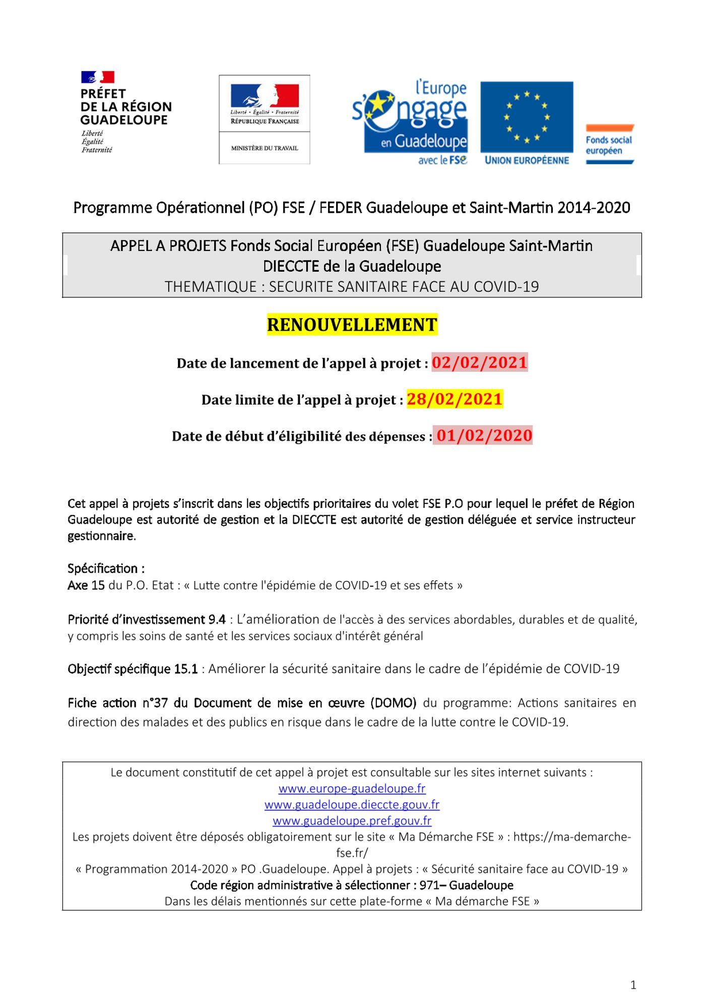 « Programmation 2014-2020 » PO. Guadeloupe. Appel à projets : « Sécurité sanitaire face au COVID 19 »