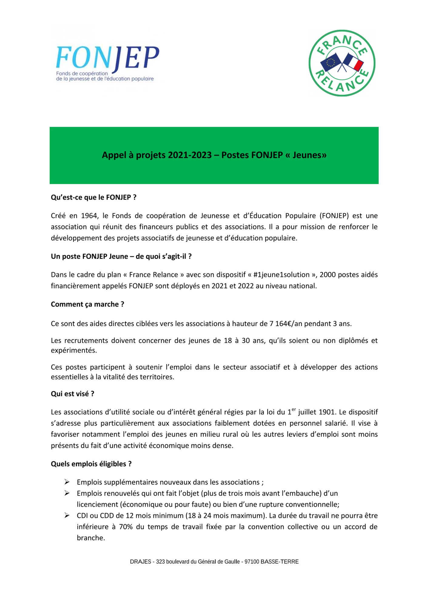 Dans le cadre du plan « France Relance » avec son dispositif « #1jeune1solution », 2000 postes aidés financièrement appelés FONJEP sont déployés en 2021 et 2022 au niveau national.