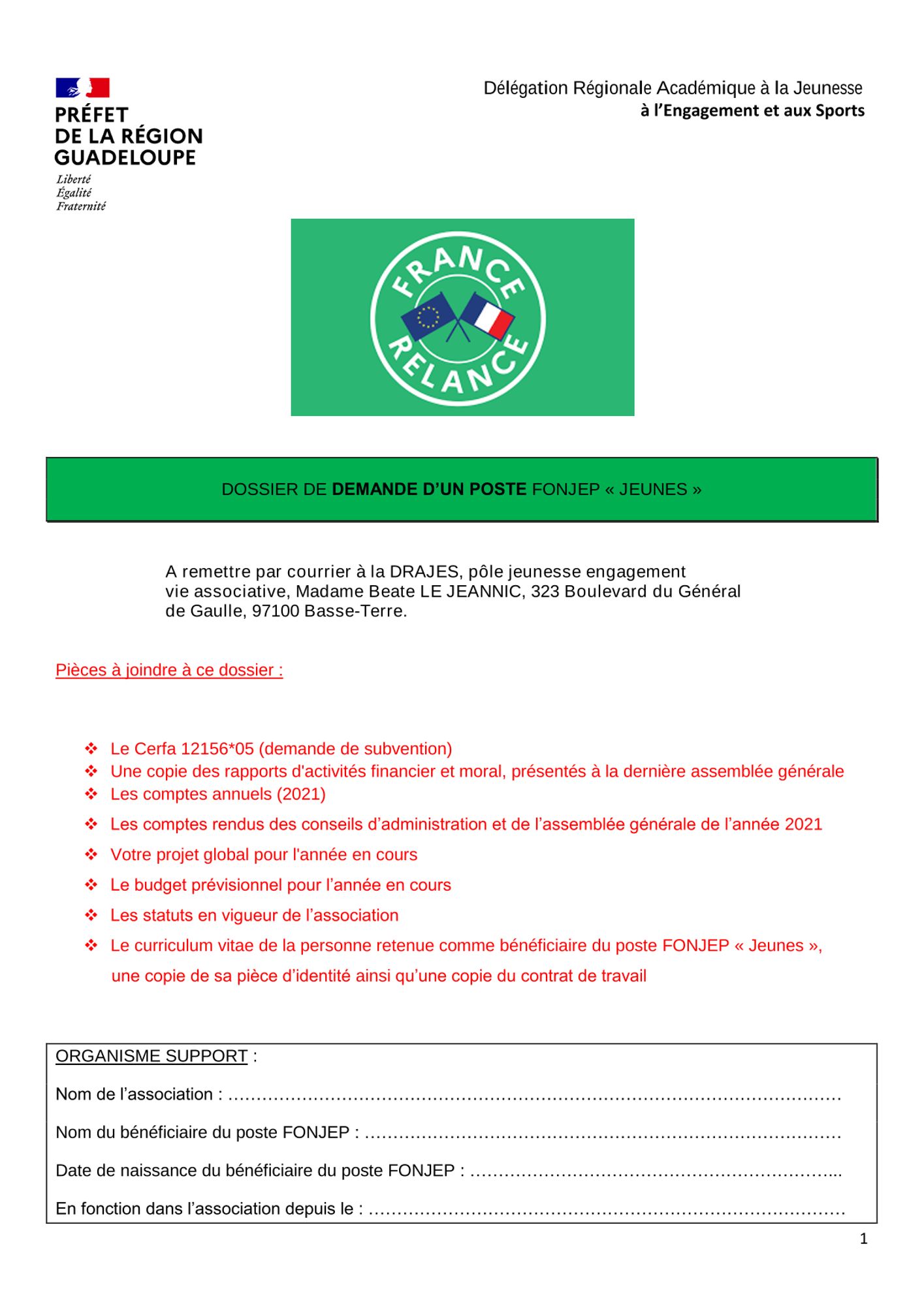 - le dossier « demande de poste FONJEP Jeunes » dûment rempli et signé ainsi que les pièces justificatives