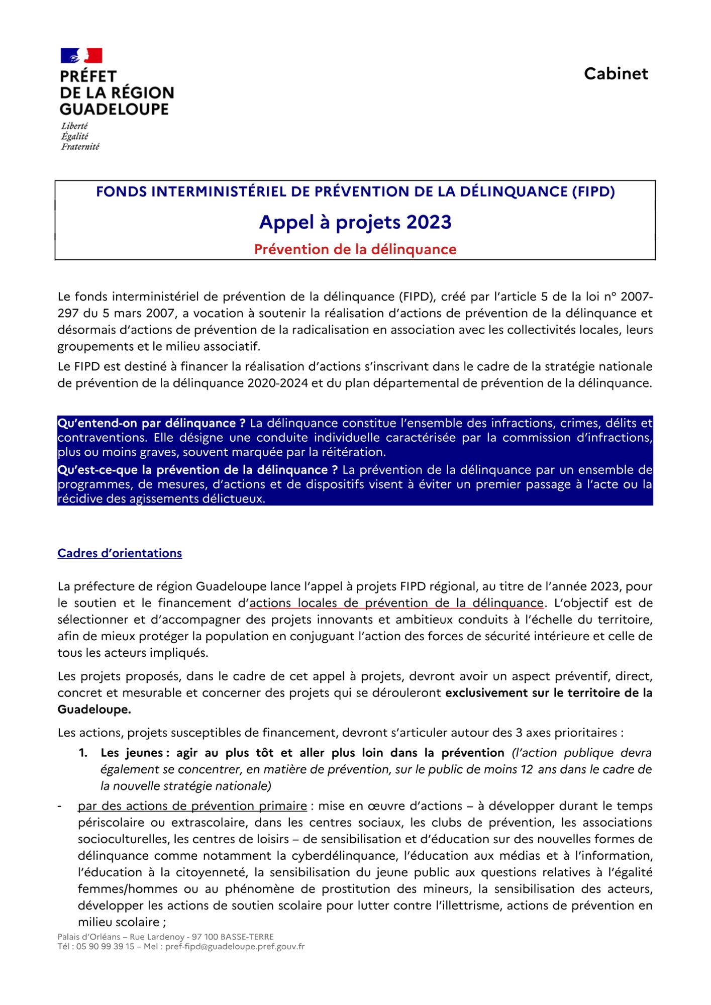 Les appels à projets finançant la réalisation de projets dans le cadre de la prévention de la délinquance, de la radicalisation, et d’actions de sécurisation, au titre de l’année 2023, sont lancés en Guadeloupe.
