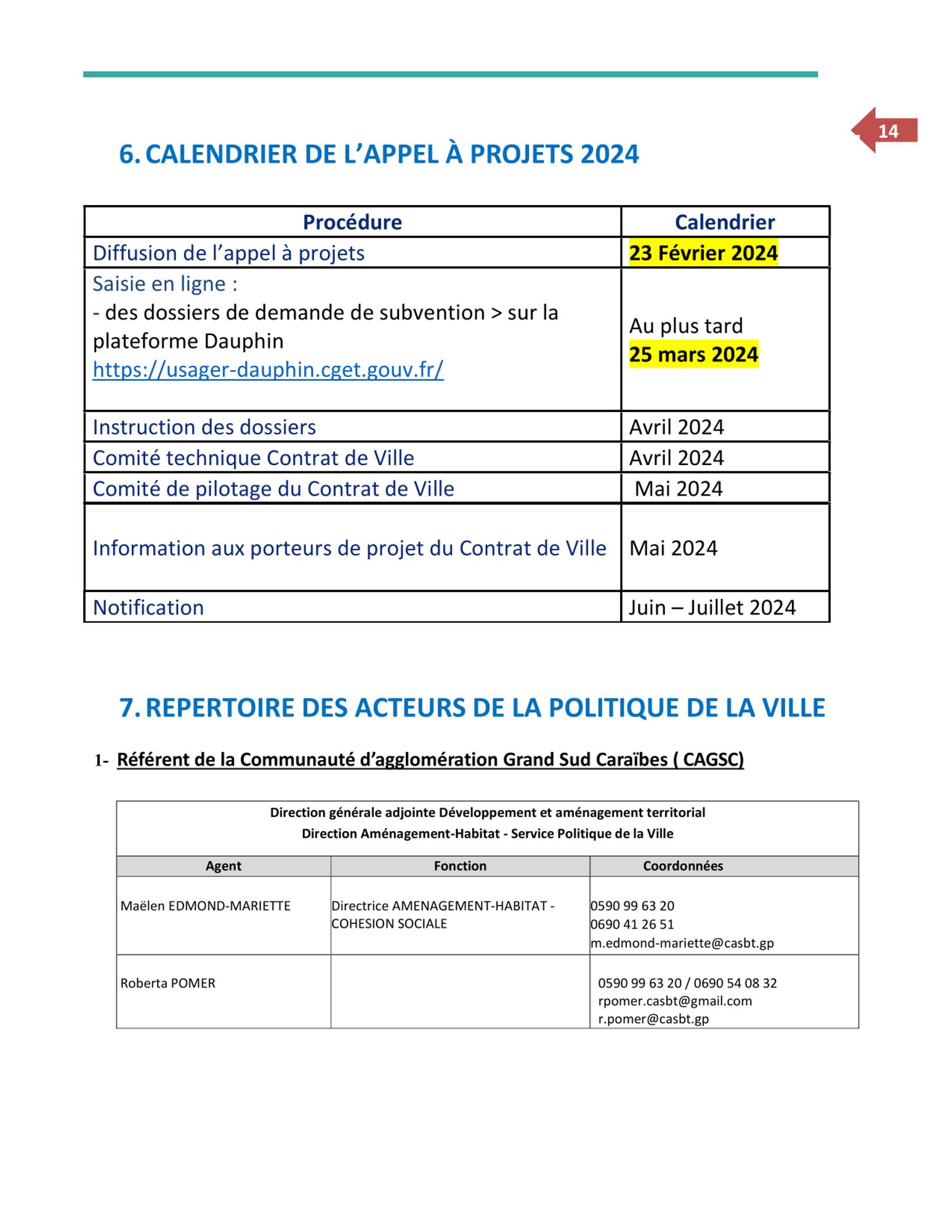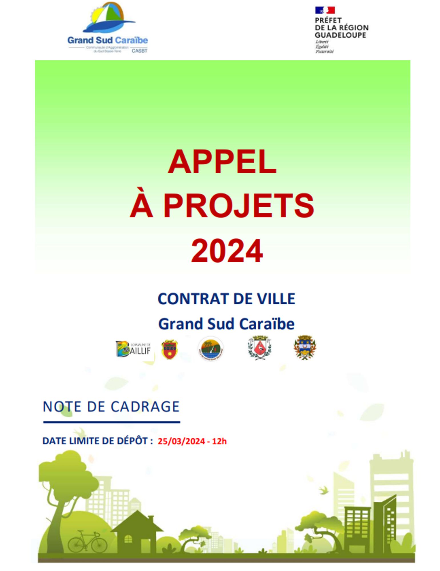 La Communauté d’Agglomération Grand Sud Caraïbe, informe les porteurs de projets de Baillif, Basse-Terre, Capesterre-Belle-Eau, Gourbeyre et Saint-Claude, de l’ouverture d’un appel à projets pour la mise en place de la Programmation annuelle 2024 du Contrat de ville au bénéfice des quartiers de la politique de la ville ou de leurs habitants.