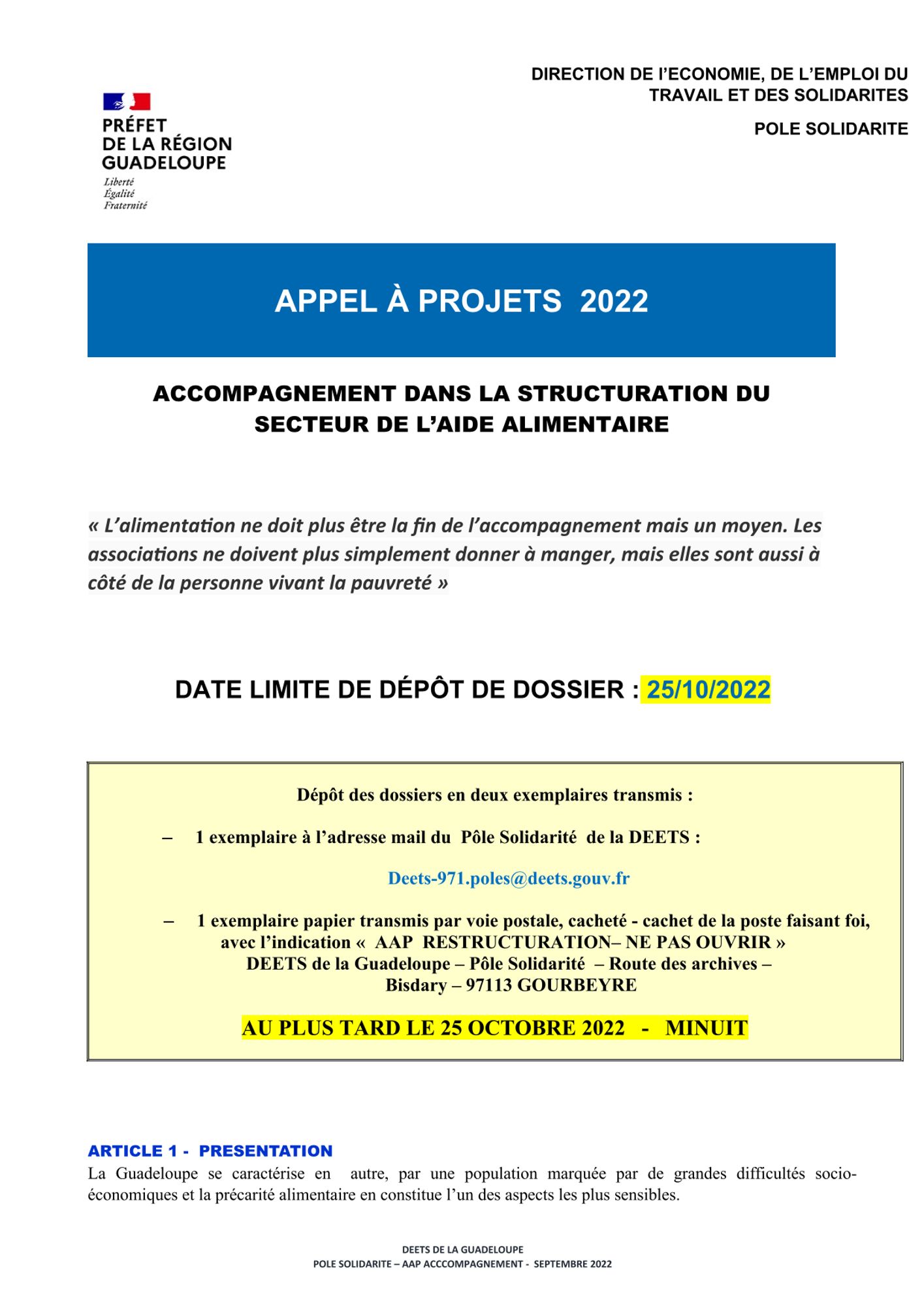 Cet appel à projet s’inscrit dans le cadre du renfort exceptionnel de 15M€ en faveur de l’aide alimentaire en Outre-Mer et concerne l’archipel guadeloupéen et les îles du nord.