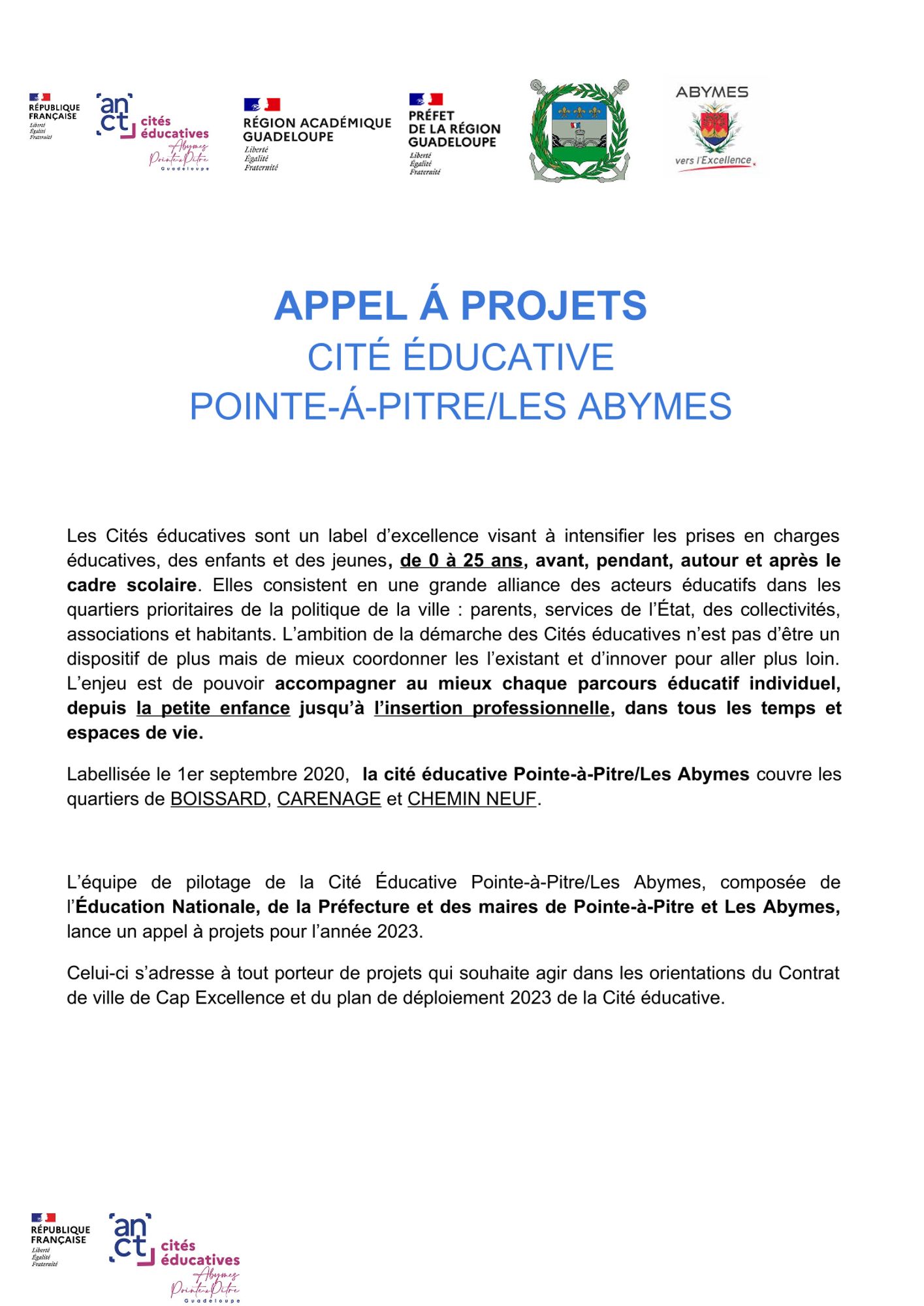 Labellisée le 1er septembre 2020, la cité éducative Pointe-à-Pitre/Les Abymes couvre les quartiers de BOISSARD, CARENAGE et CHEMIN NEUF. L’appel à projets s’adresse à tout porteur de projets qui souhaite agir dans les orientations du Contrat de ville et du plan de déploiement 2022-2023 de la Cité éducative en l’invitant à se concentrer sur le champ de la prévention des ruptures, avant tout sociales.