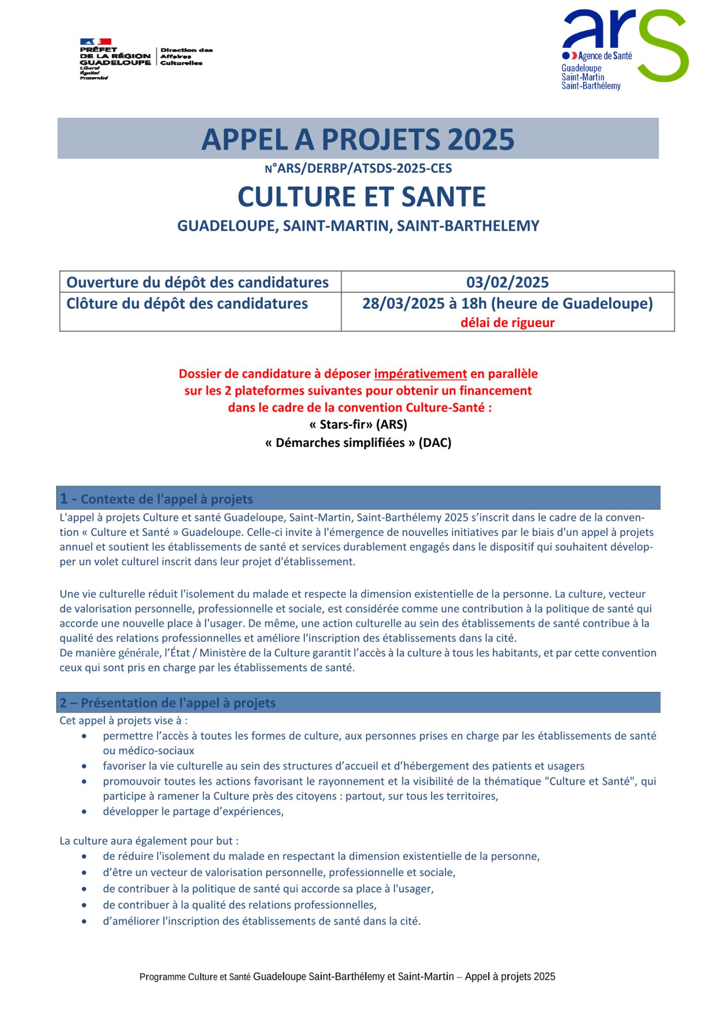 Cet appel à projet s’inscrit dans le cadre de la convention « Culture et Santé » Guadeloupe entre la Direction de l'Action Culturelle Guadeloupe et îles du Nord et l'Agence de Santé Guadeloupe, Saint-Martin, Saint-Barthélemy. Celle-ci invite à l'émergence de nouvelles initiatives par le biais d'un appel à projets annuel et soutient les établissements de santé et services durablement engagés dans le dispositif qui souhaitent développer un volet culturel inscrit dans leur projet d'établissement.