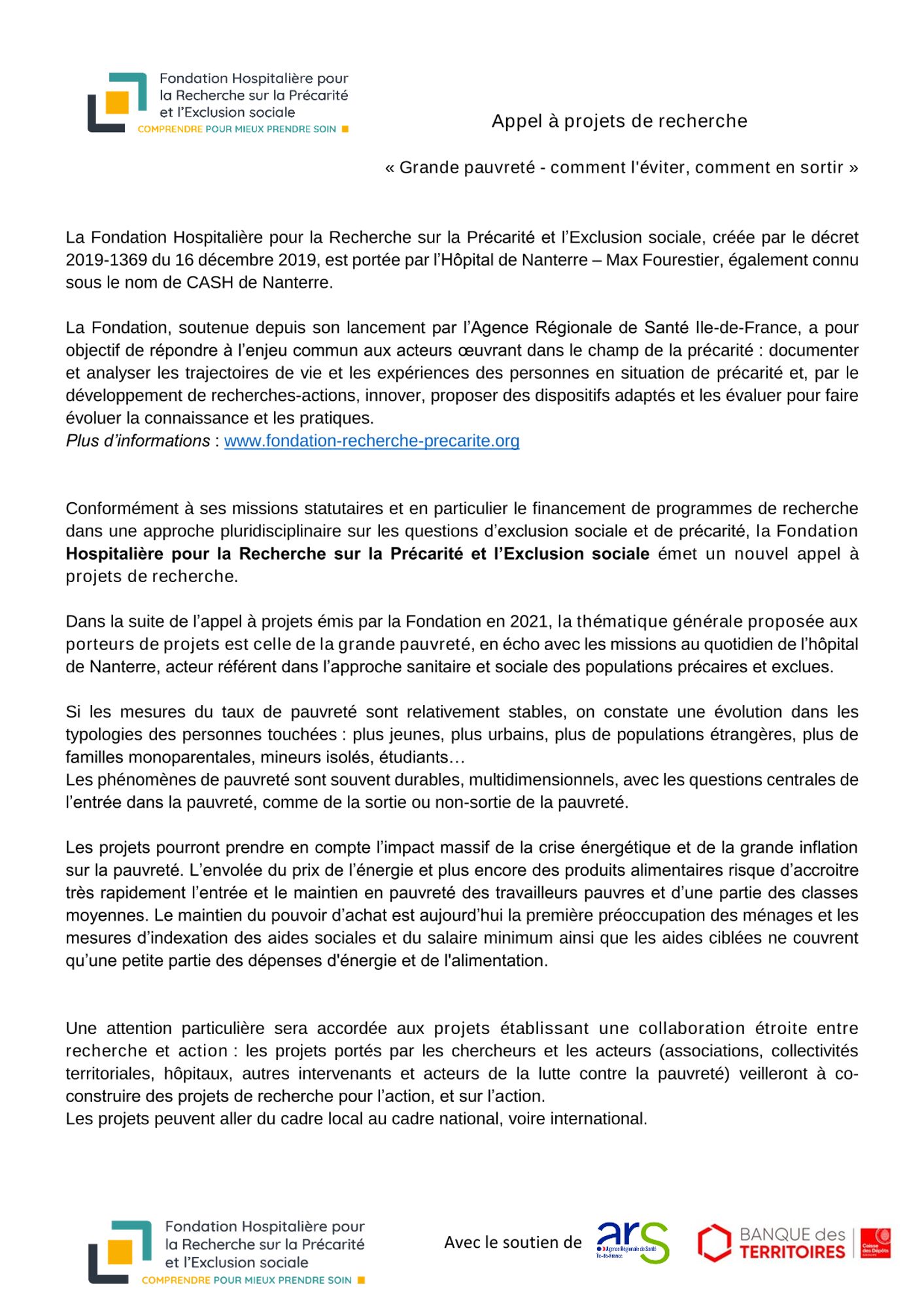 Dans la suite de l'appel à projets émis en 2021, la fondation hospitalière pour la recherche sur la précarité et l'exclusion sociale, émet un nouvel appel à projets de recherche sur la thématique générale de la grande pauvreté.