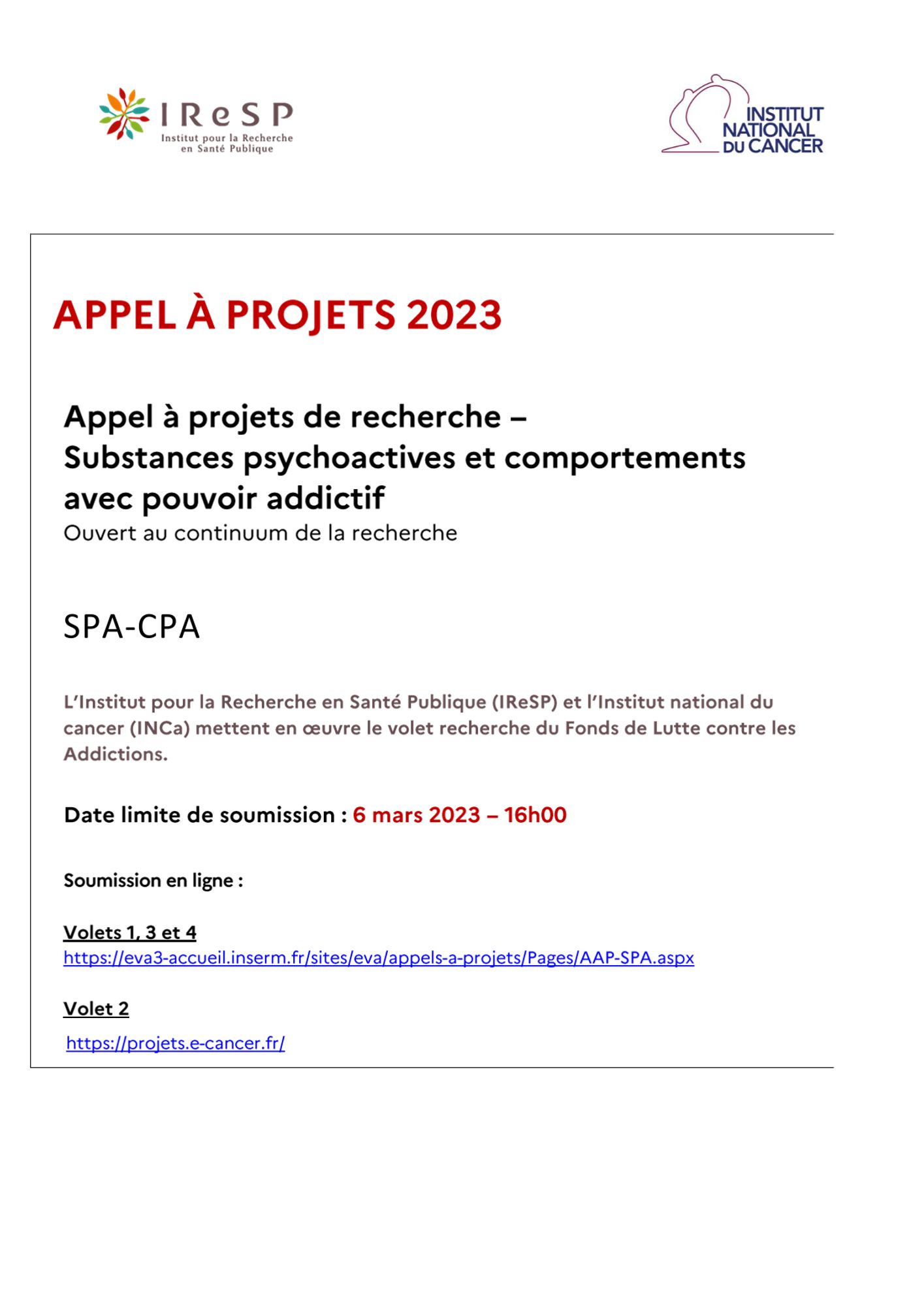 L’Institut national du cancer (INCa) et l’Institut pour la recherche en santé publique (IReSP) lancent un nouvel appel à projets de recherche sur les substances psychoactives et les comportements avec pouvoir addictif.