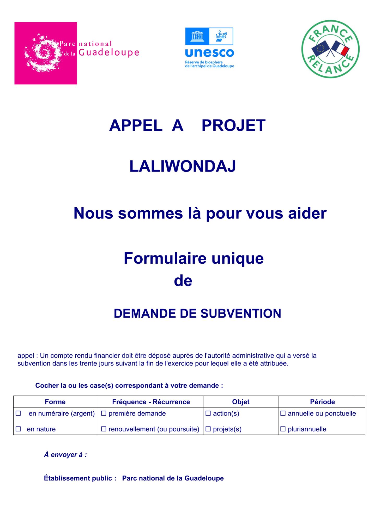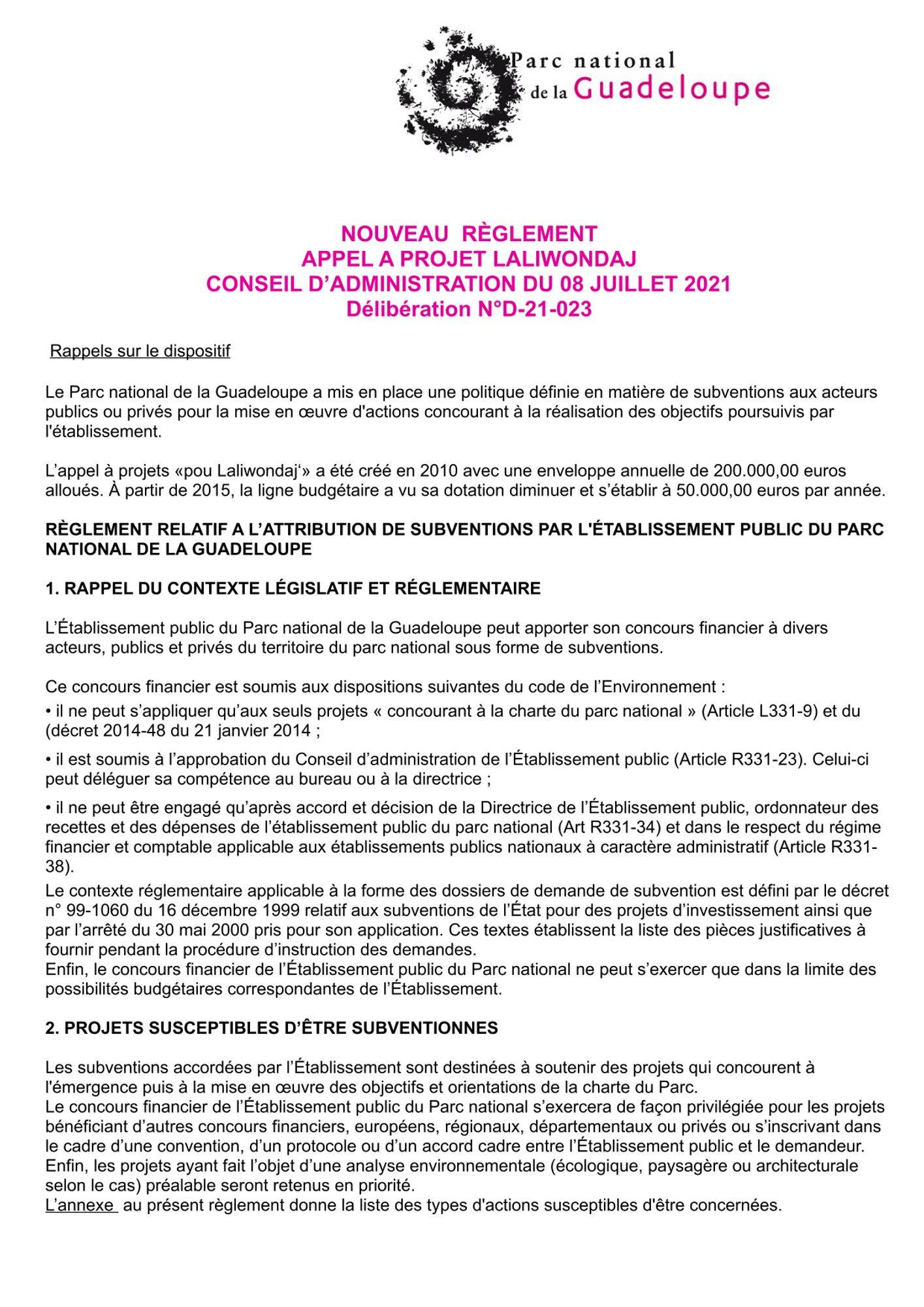 Afin de contribuer à la mise en œuvre de sa politique du développement durable, le Parc national de la Guadeloupe soutient des projets qui visent à développer le territoire et s’inscrivent comme « durables » par des activités économiques et sociales innovantes et créatives, préservant l’environ-nement. Ces projets doivent avoir pour objectif la conservation et la valorisation du territoire situé en aire d’adhésion, en aire maritime adjacente et par des activités respectueuses des patrimoines naturel, culturel, et paysager des cœurs de Parc national.