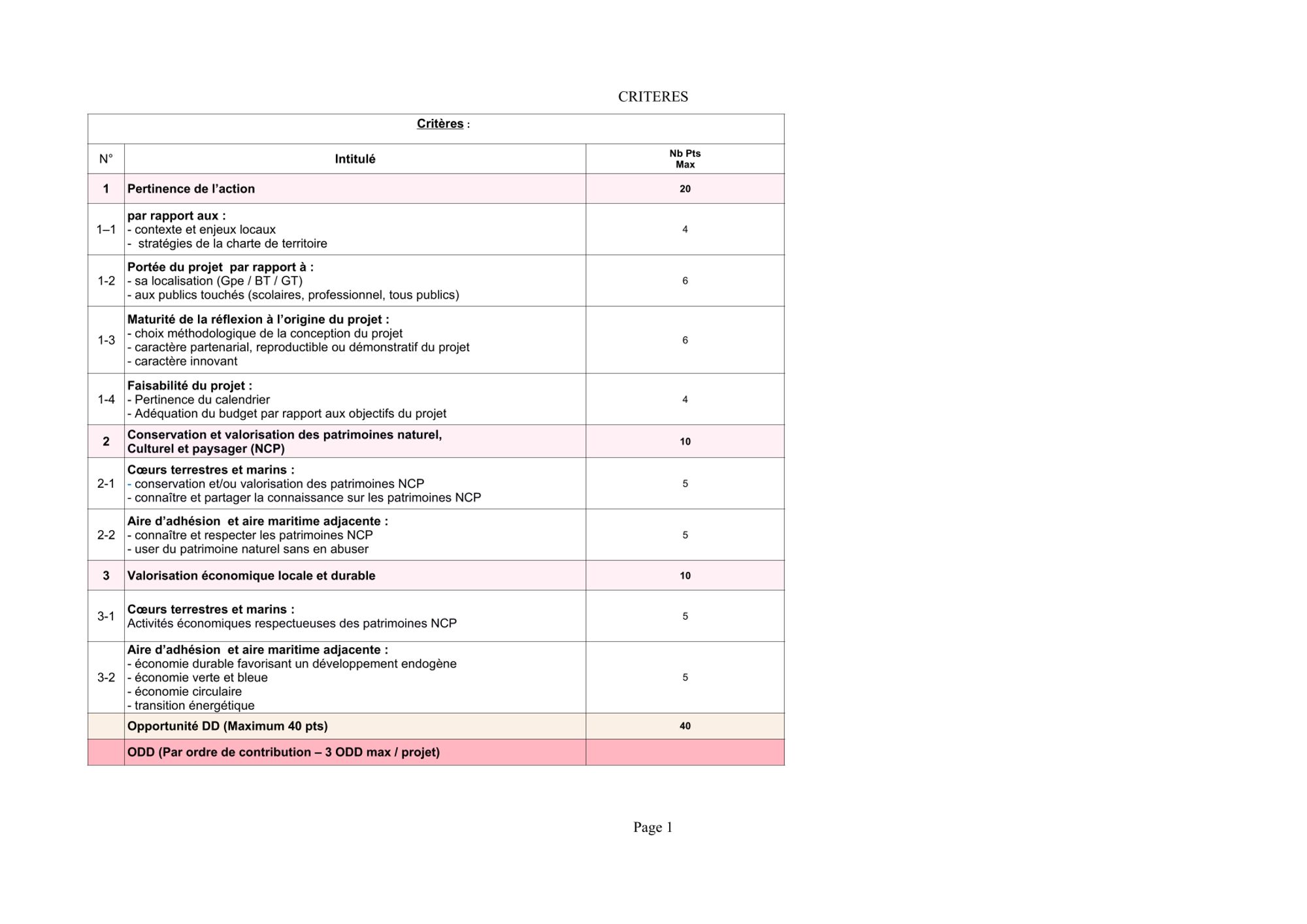 Liste des critères