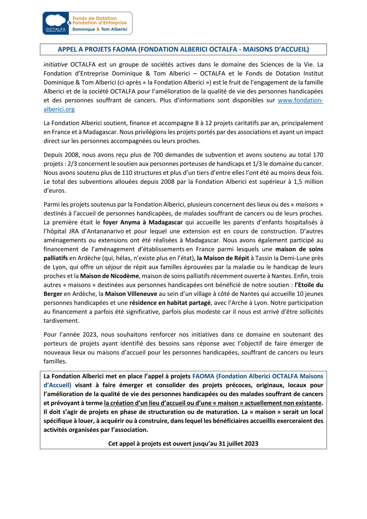 Appel à projets FAOMA (Fondation Alberici OCTALFA Maisons d’Accueil)