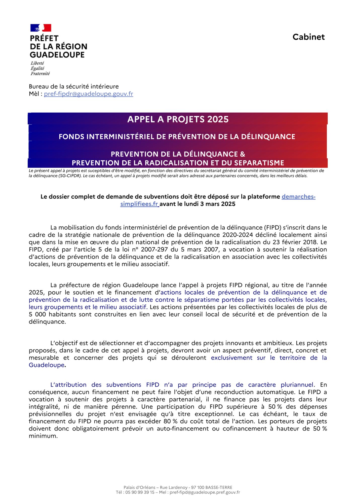 La Préfecture de Région Guadeloupe annonce le lancement des appels à projets finançant la réalisation de projets dans le cadre de la prévention de la délinquance, de la radicalisation, et d’actions de sécurisation, au titre de l’année 2025, en Guadeloupe.