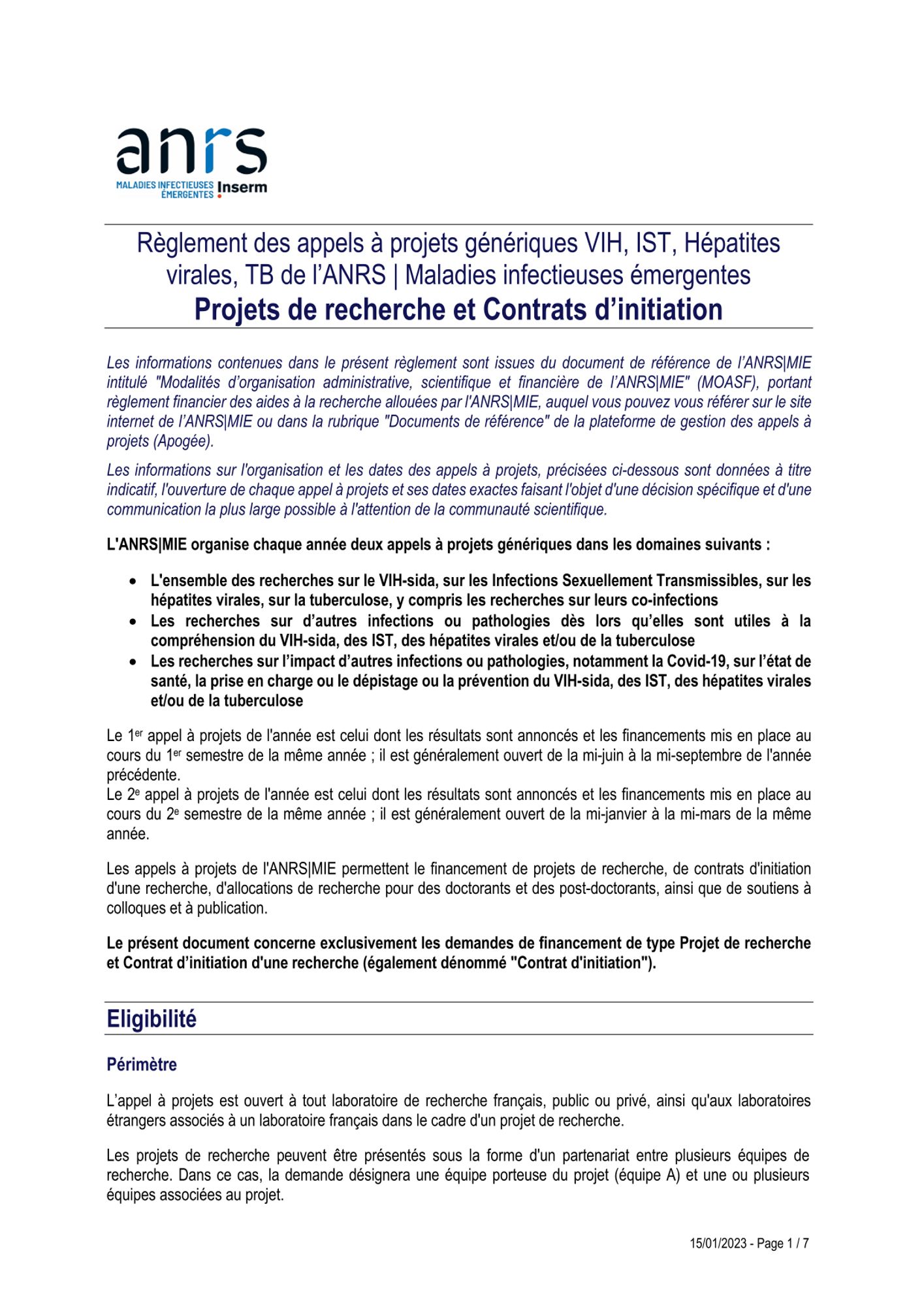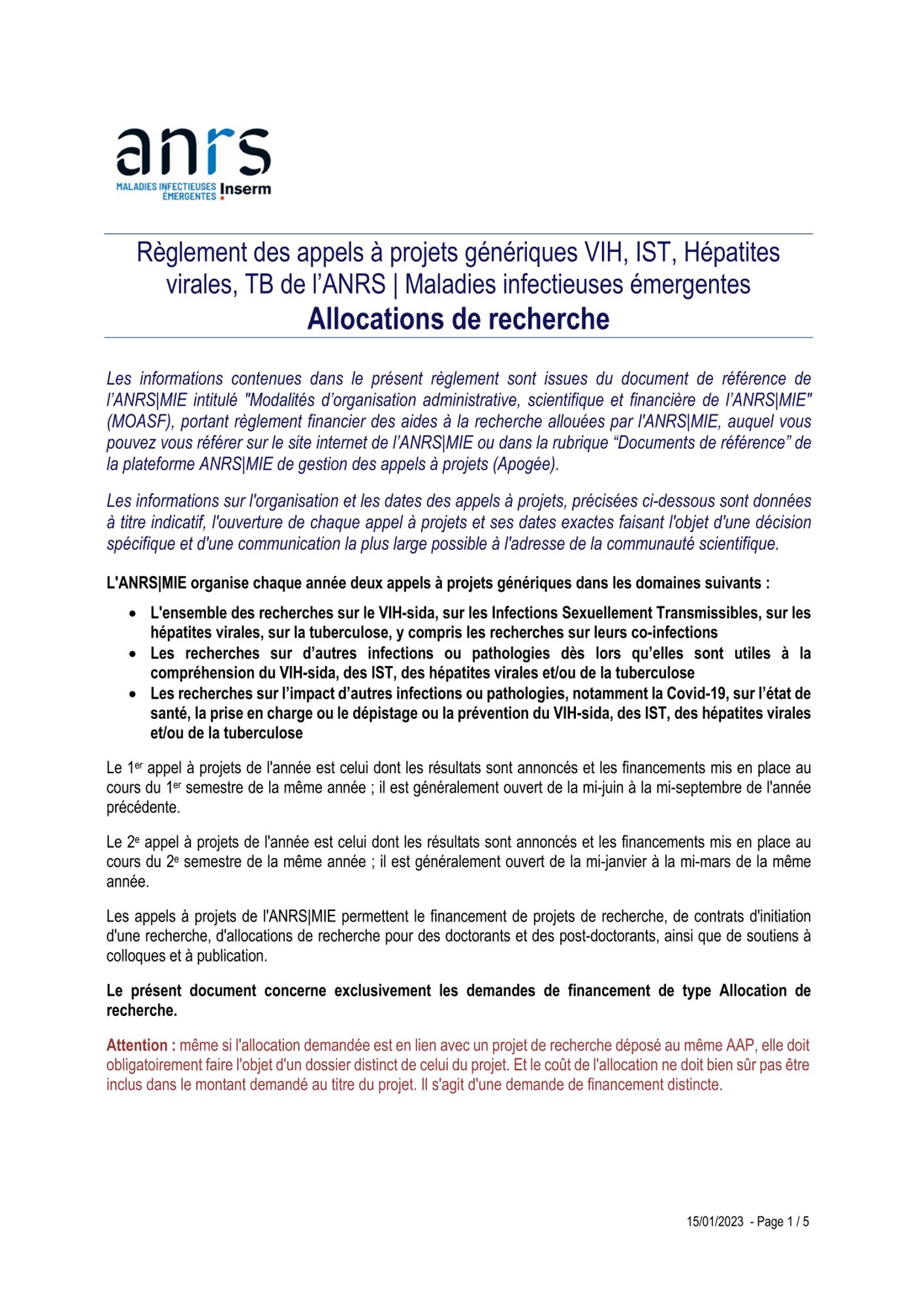 Prendre connaissance des détails dans le contenu des règlements de chaque appel à projets générique et consulter le site Internet de l'ANRS-MIE (Je soumets mon projet).