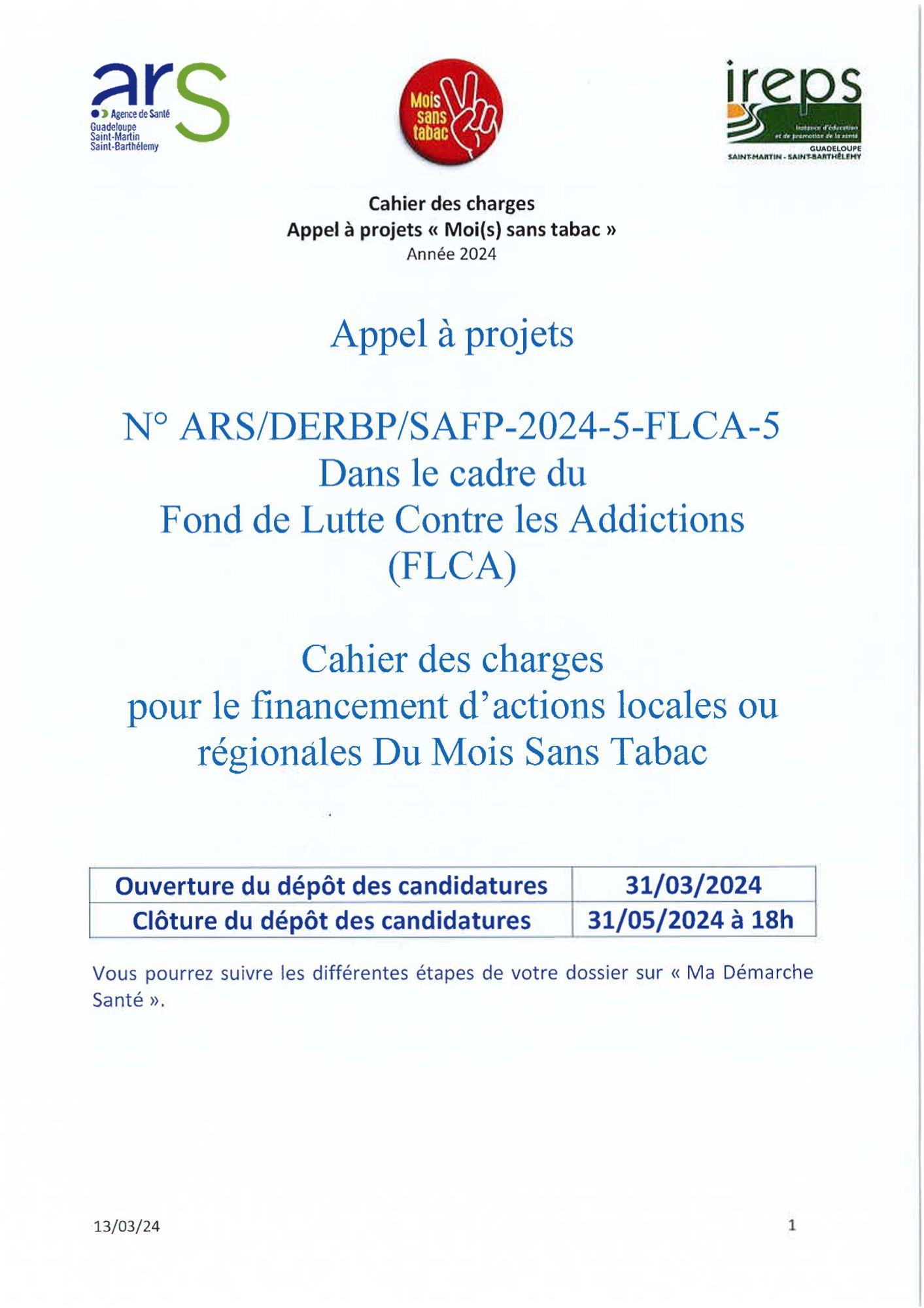 La procédure de dépôt des projets est dématérialisée, les porteurs de projets doivent se rendre sur le site Ma Démarche Santé (MDS) et déposer les dossier pour le 31/05/2024 à 18 heures.