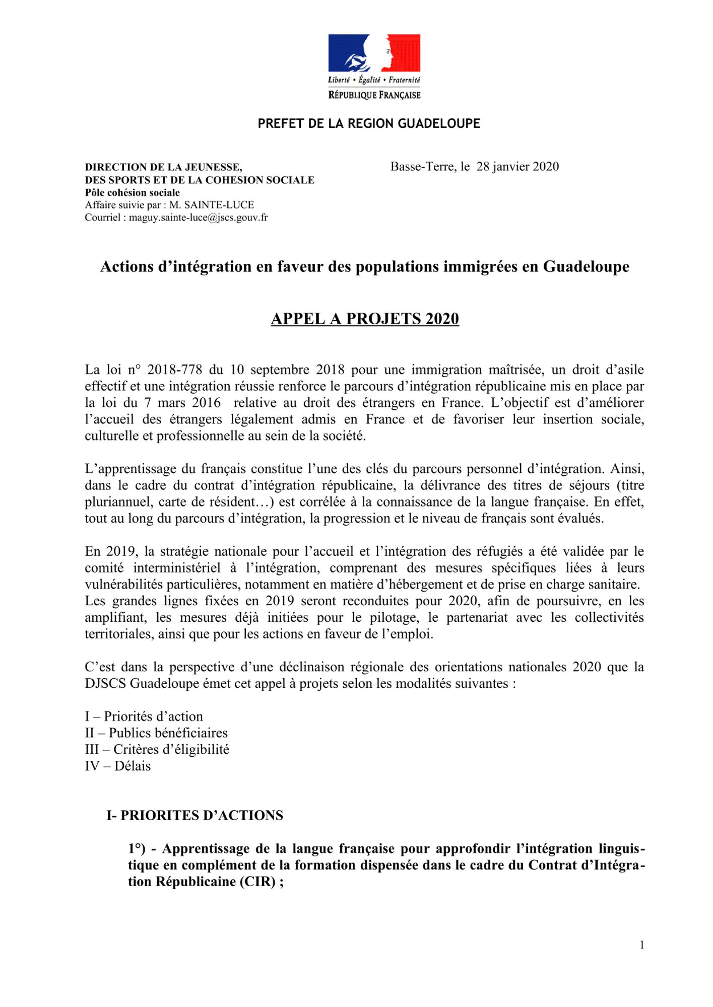 Dans le cadre de la stratégie nationale pour l’accueil et l’intégration des réfugiés de 2019, validée par le comité interministériel à l’intégration, qui a pour objectifs d’améliorer l’accueil des étrangers légalement admis en France et de favoriser leur insertion sociale, culturelle et professionnelle au sein de la société. Le préfet de la région Guadeloupe lance, au titre de l'année 2020, un appel à projets pour la création et la mise en place d'actions d'intégration en faveur des étrangers primo-arrivants des pays tiers à l'Union Européenne en Guadeloupe. Les dossiers complets sont à déposer le lundi 16 mars 2020 au plus tard.