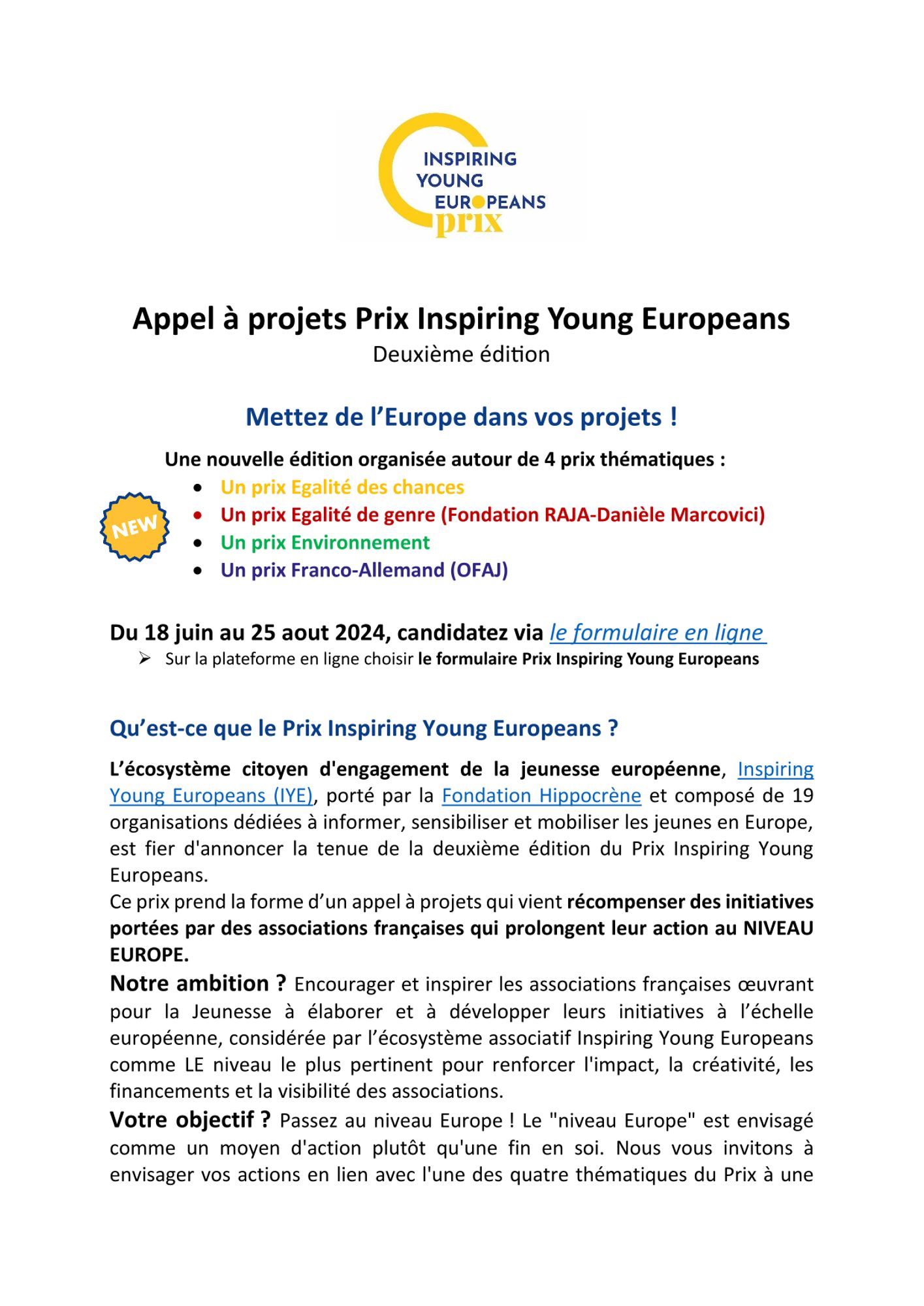 Le Prix Inspiring Young Europeans 2024 est porté par l'écosystème IYE, le premier réseau citoyen d'engagement de la jeunesse européenne. Ce prix prend la forme d’un appel à projets qui vient récompenser des initiatives portées par des associations françaises qui prolongent leur action au NIVEAU EUROPE. L'objectif : inclure des jeunes d'autres pays européens à des projets en lien avec la démocratie.