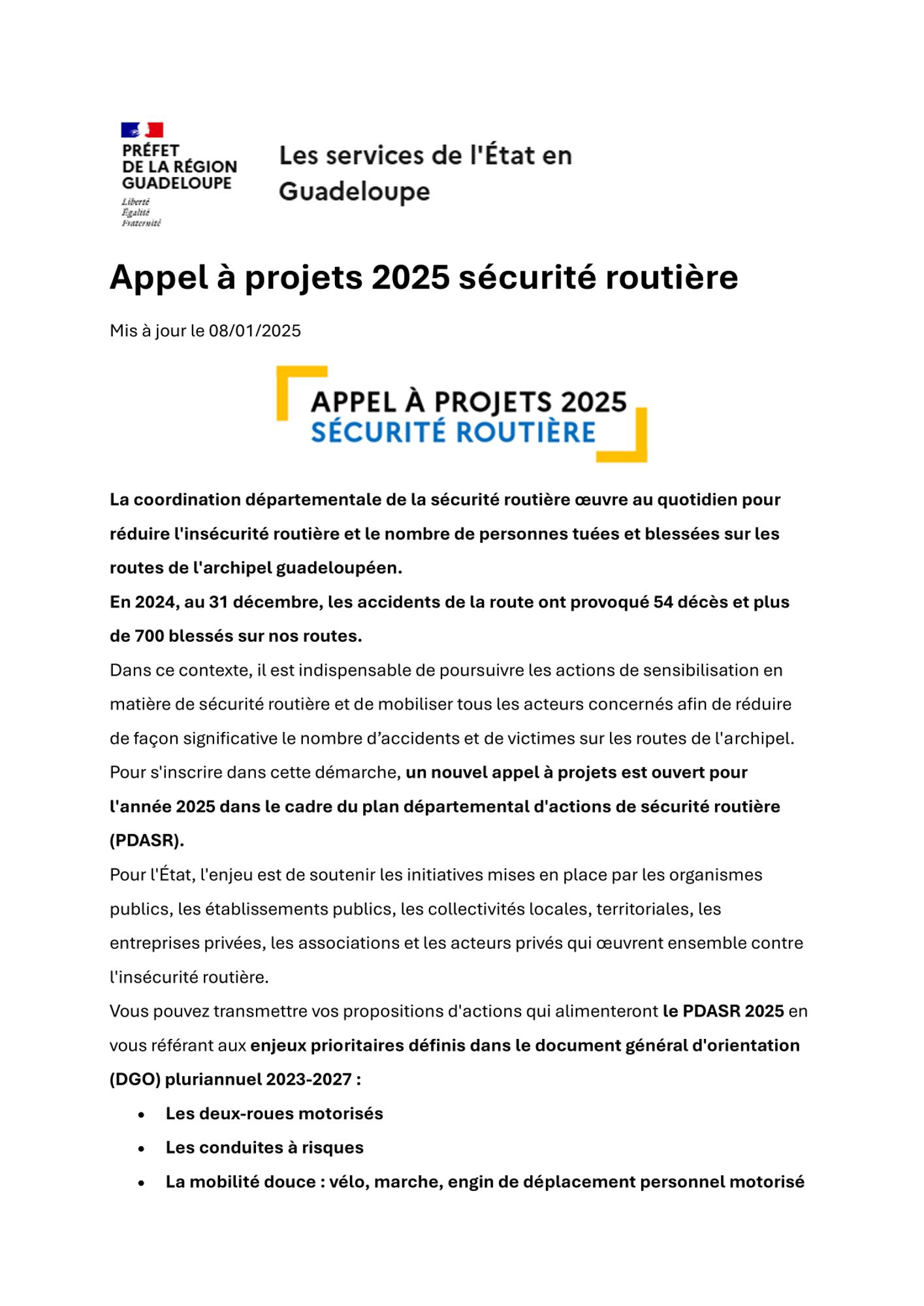 Comme chaque année, la préfecture de la Guadeloupe lance un appel à projets dans le cadre du Plan Départemental d’Actions de Sécurité Routière (PDASR) pour mobiliser et fédérer tous les acteurs guadeloupéens sensibilisés à la sécurité routière, en proposant un soutien financier aux porteurs de projets pour faire émerger des actions de prévention innovantes et efficientes afin de faire reculer le nombre d’accidents et de victimes de la route.