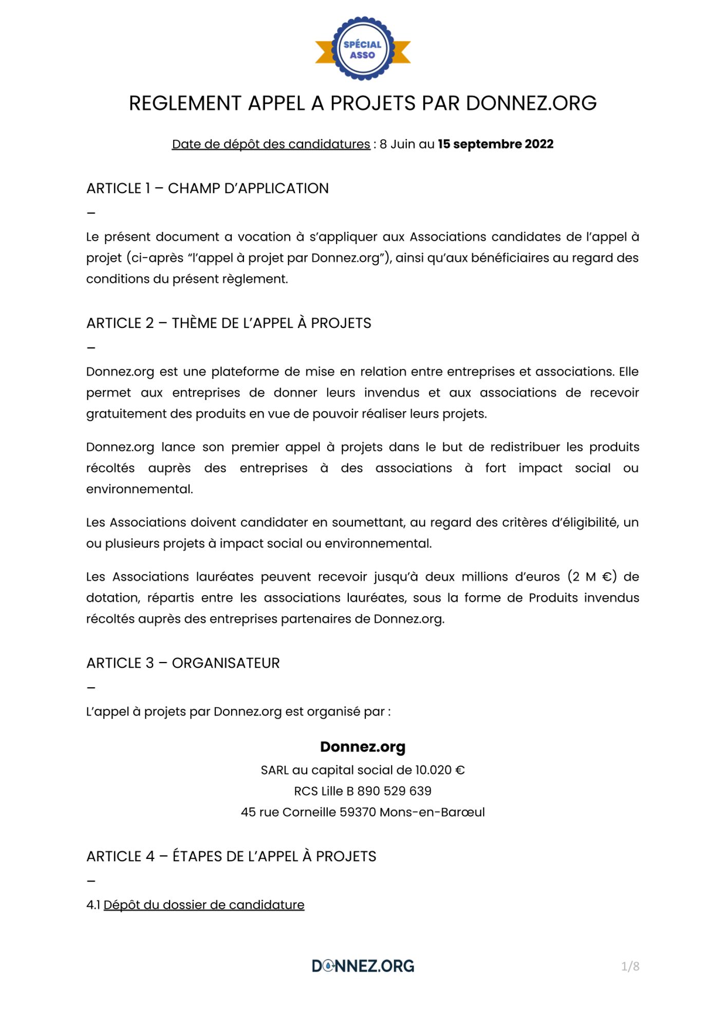 Les Associations lauréates peuvent recevoir jusqu’à deux millions d’euros (2 M €) de dotation, répartis entre les associations lauréates, sous la forme de Produits invendus récoltés auprès des entreprises partenaires de Donnez.org.