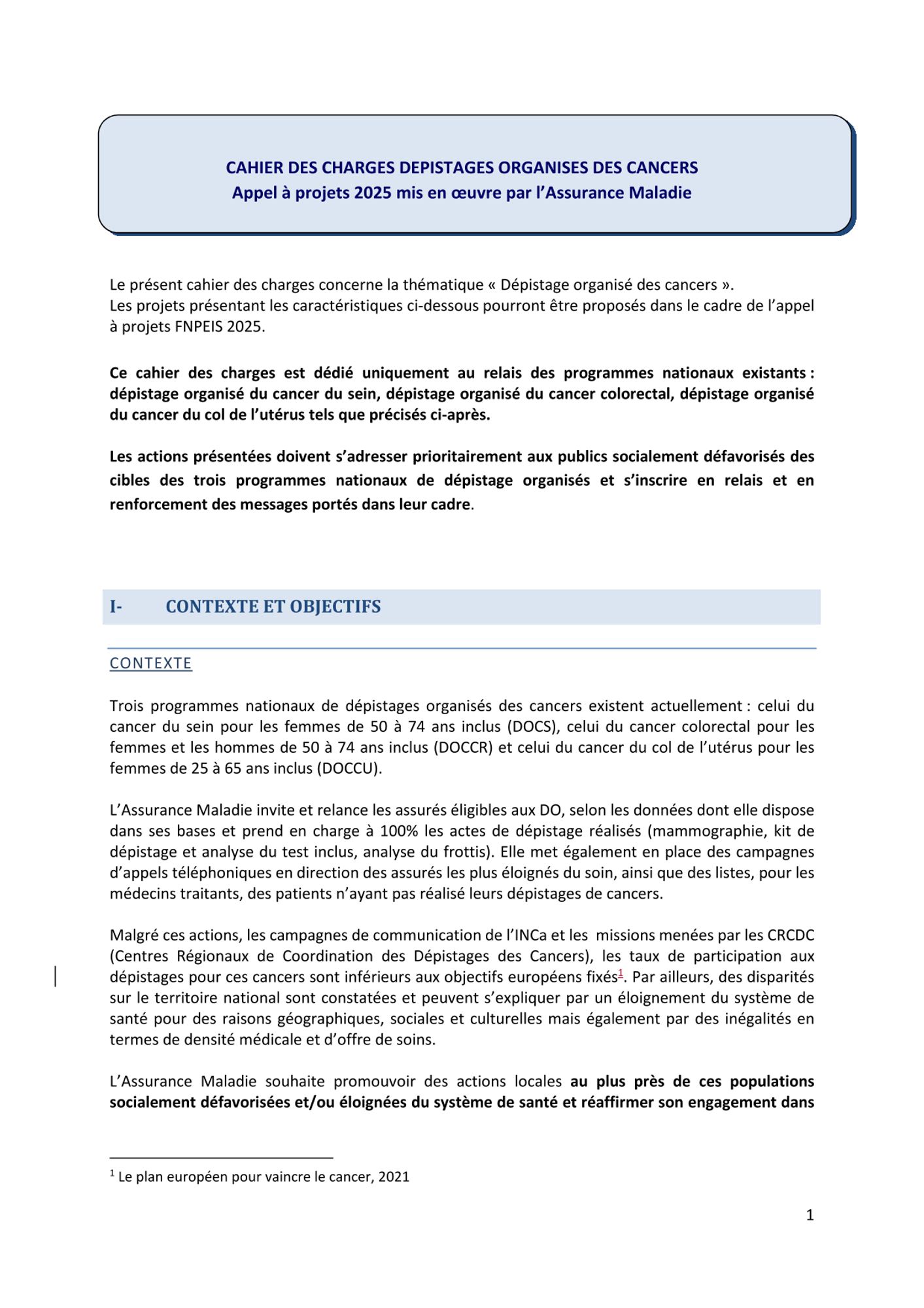 Cet appel à projets 2025 de, l'Assurance Maladie est axé sur le dépistage organisé des cancers du sein, colorectal et du col de l'utérus. Il vise à promouvoir des actions locales pour augmenter la participation aux dépistages, en ciblant les populations socialement défavorisées et éloignées du système de santé.
