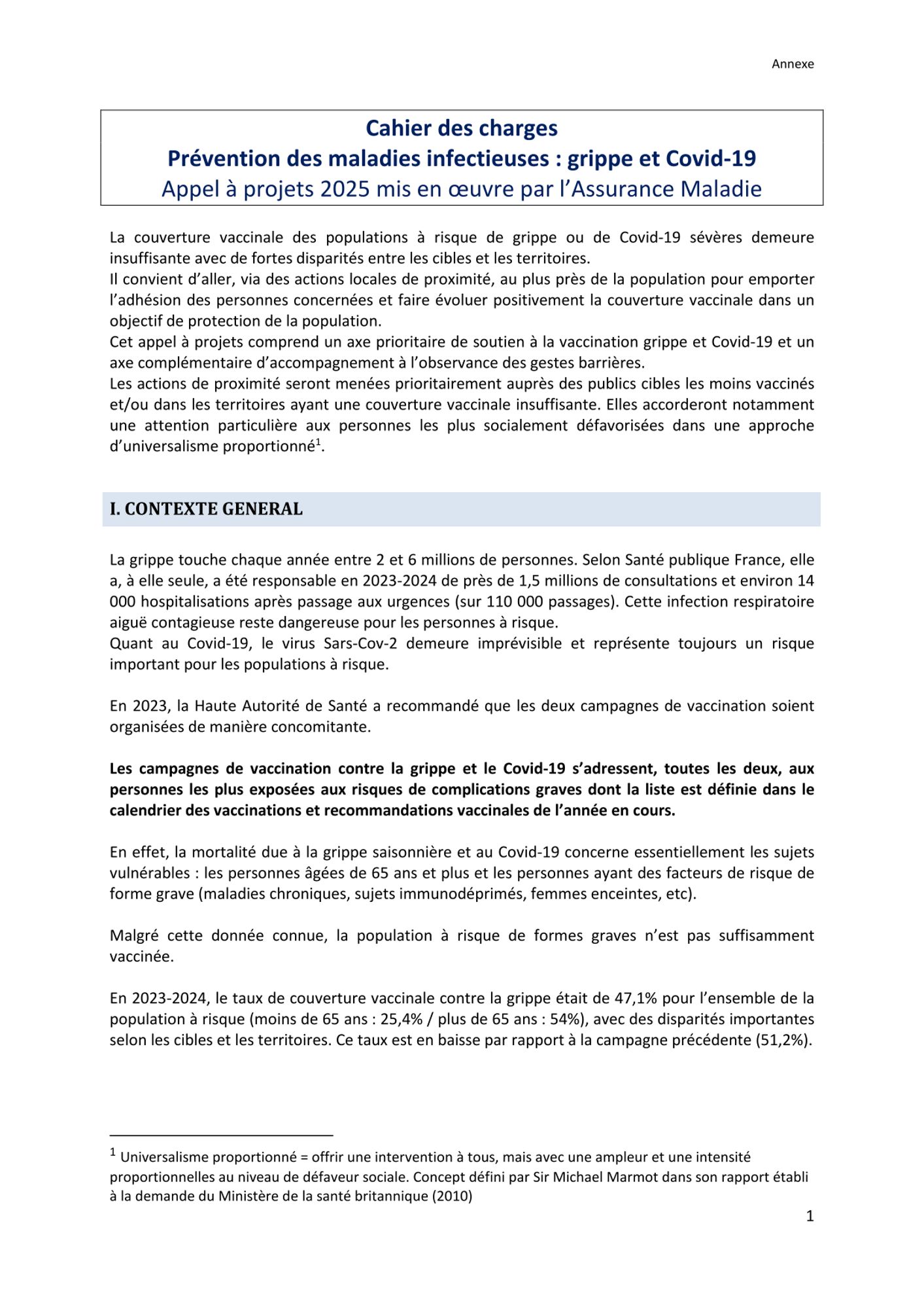 Cet appel à projets 2025 de l'Assurance Maladie est axé sur le soutien prioritaire à la vaccination grippe et Covid-19 et un axe complémentaire d'accompagnement à l'observance des gestes barrières.. Il vise à promouvoir des actions locales auprès des publics cibles les moins vaccinés et/ou dans les territoires ayant une insuffisante couverture vaccinale, en ciblant les populations socialement défavorisées et éloignées du système de santé.