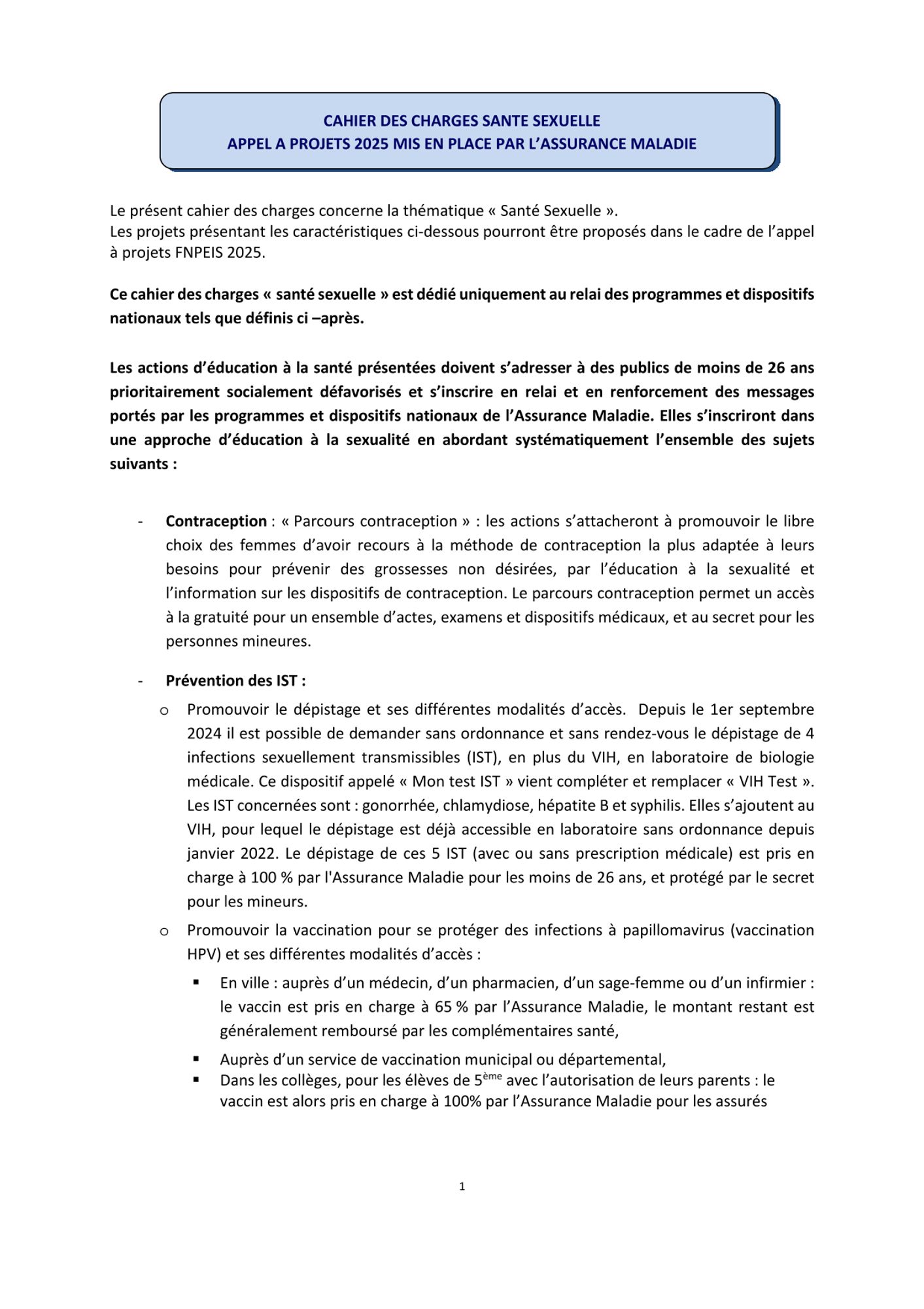 Cet appel à projets 2025 de, l'Assurance Maladie vise à développer des actions locales innovantes visant à promouvoir l'éducationà la sexualité et la prévention des IST auprès des jeunes de moins de ans, en particulier ceux issus de milieux socialement défavorisés.