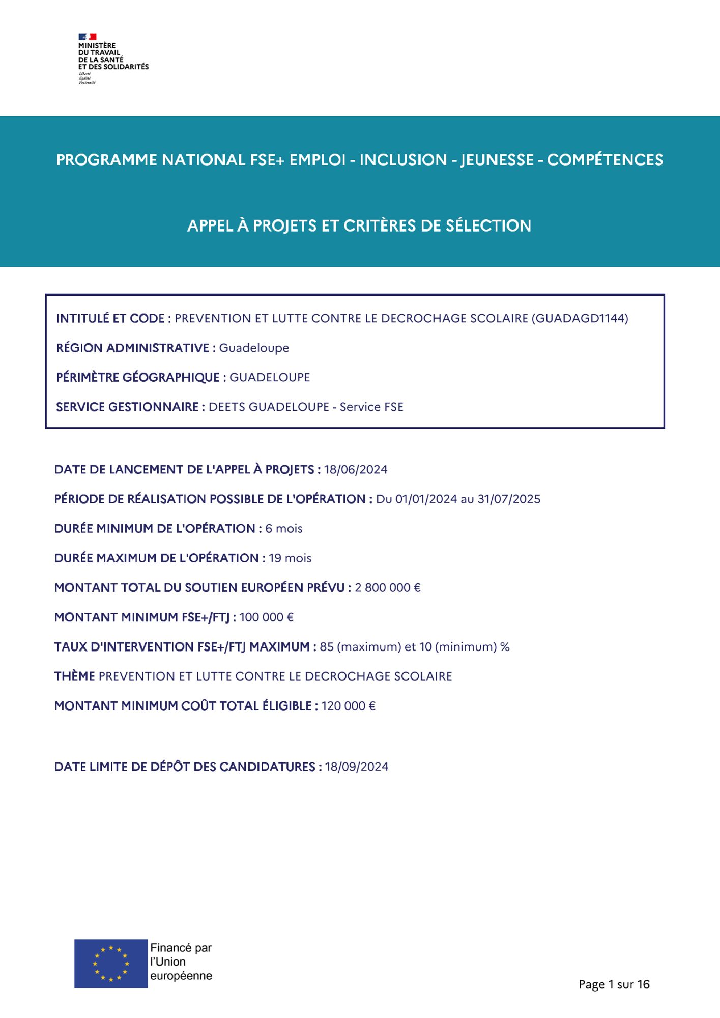 La lutte contre le décrochage scolaire est une priorité nationale autour d’un objectif central : faire que chaque jeune puisse construire son avenir professionnel et réussir sa vie en société. De fait, cet appel à projets s’inscrit dans les objectifs prioritaires du volet FSE P.O pour lequel le préfet de Région Guadeloupe est autorité de gestion et la DEETS est autorité de gestion déléguée et service instructeur gestionnaire.
