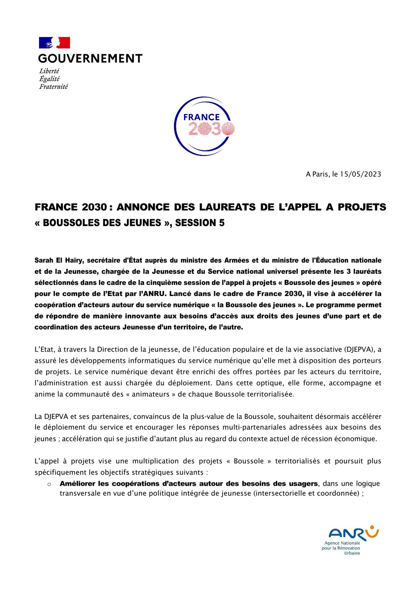Partant du constat que les jeunes sont trop peu ou mal informés des droits et services les concernant, l'Etat via la Direction de la Jeunesse, de l’Education Populaire et de la Vie Associative (DJEPVA) a créé une plateforme numérique dédiée, dénommée la Boussole des jeunes qui répond à cette problématique en regroupant les informations pertinentes à l’échelle du territoire. C'est dans ce cadre, que le Secrétariat Général pour l’Investissement (SGPI) a confié à l’Agence Nationale pour la Rénovation Urbaine le lancement d’un appel à projets opéré pour le compte de l'État et ouvert jusqu’au 30 juin 2023. Celui-ci vise à faire émerger sur les territoires de nouveaux partenariats innovants pour déployer la boussole.