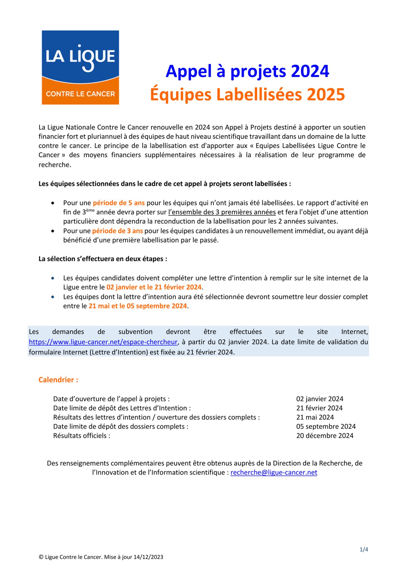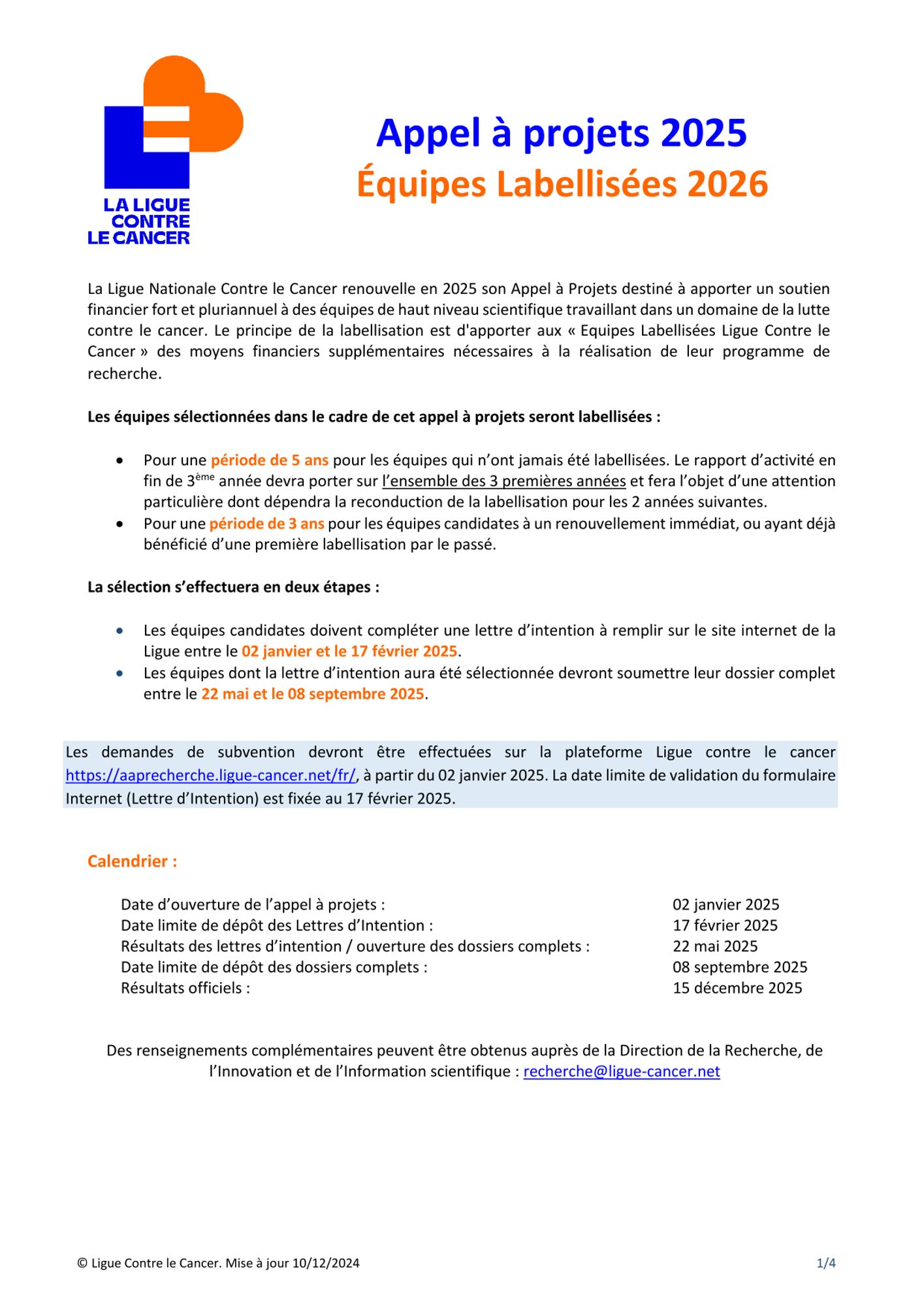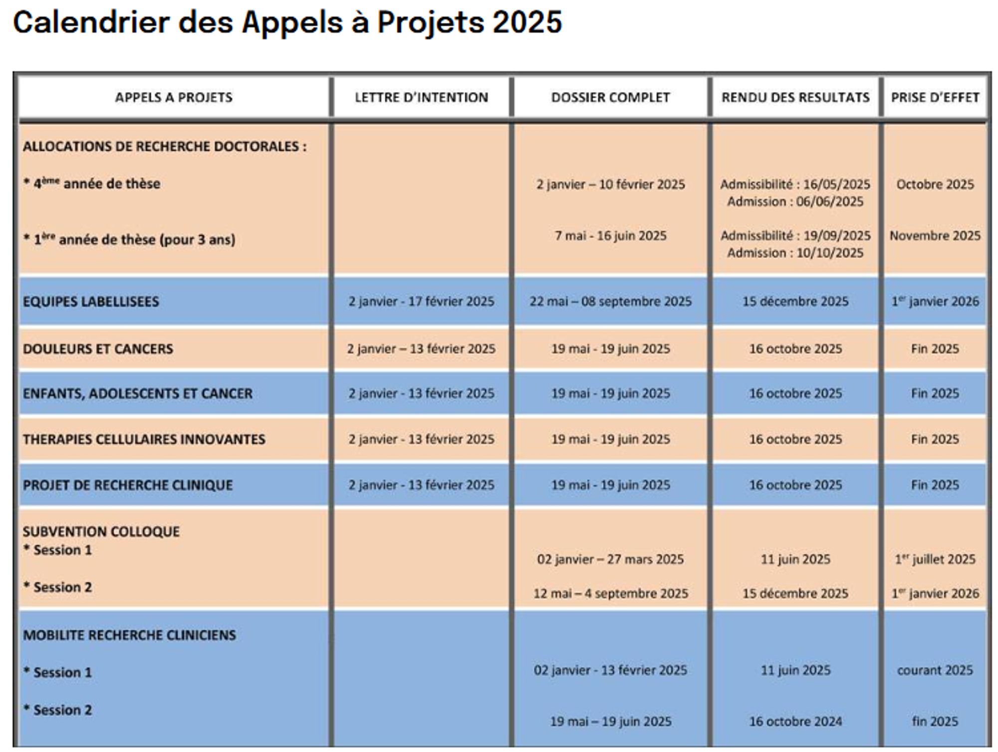 Calendrier des appels à projets de Recherche 2025 - Equipes labellisées en 2026