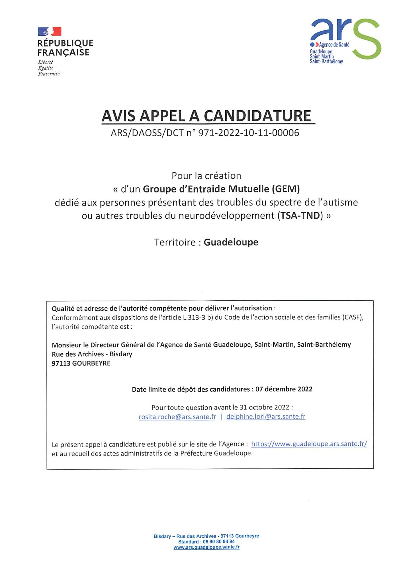 Le présent appel à candidature doit permettre aux acteurs souhaitant de s'engager dans la construction d'un GEM TSA/ TND de déposer un projet auprès de l'Agence de Santé Guadeloupe , Saint-Martin, Saint-Barthélemy.