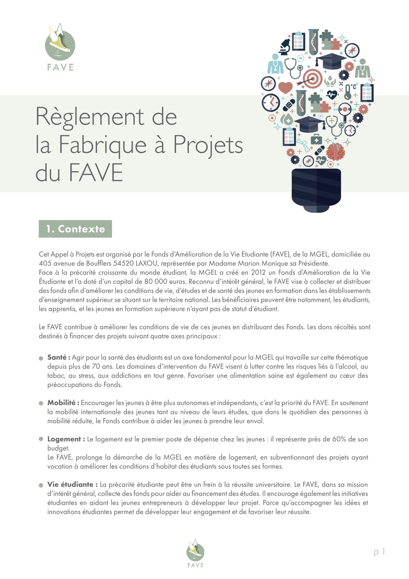 Fondé en 2012 à l’initiative de la MGEL, mutuelle étudiante solidaire et engagée, le FAVE, Fonds d’Amélioration de la Vie Étudiante a pour objectif de développer et soutenir des initiatives partout en France, visant à améliorer les conditions de vie des 18-35 ans. Logement, mobilité, santé et vie étudiante sont les 4 piliers du FAVE.