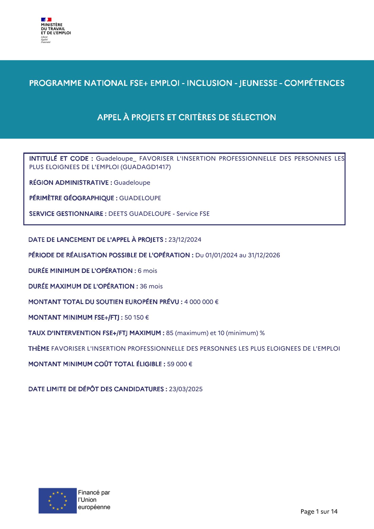 Dans le cadre de la mise en œuvre du volet régional du programme national FSE+ 2021-2027, la préfecture de Guadeloupe a relancé l'appel à projet "Favoriser l'insertion professionnelle des personnes les plus éloignées de l'emploi".