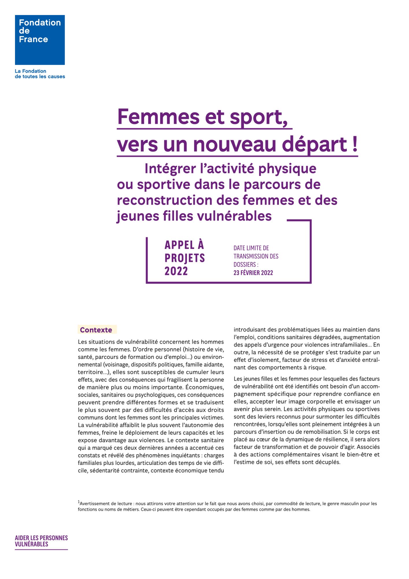A travers cet appel à projets, la Fondation de France entend soutenir des projets en France ayant pour objectif d’utiliser l’activité physique en articulation avec des actions relevant du développement du pouvoir d’agir à destination de femmes ou de jeunes filles présentant des signes de vulnérabilité, pour améliorer leur parcours global d’insertion.