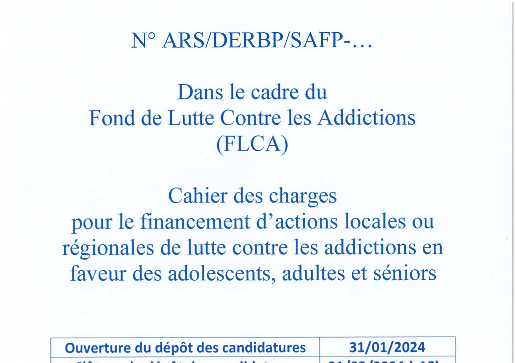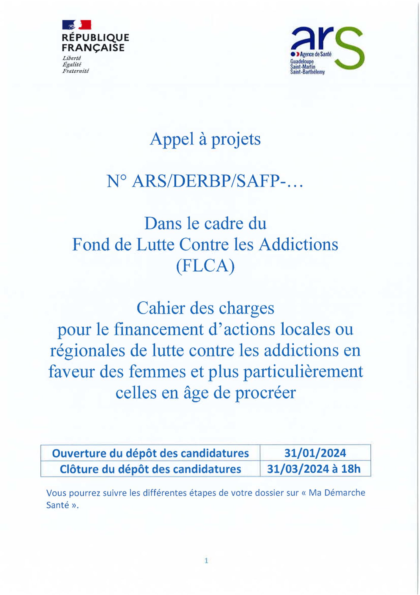 La procédure de dépôt des projets est dématérialisée, les porteurs de projets doivent se rendre sur le site Ma Démarche Santé (MDS) et déposer les dossier pour le 31/03/2024 à 18 heures