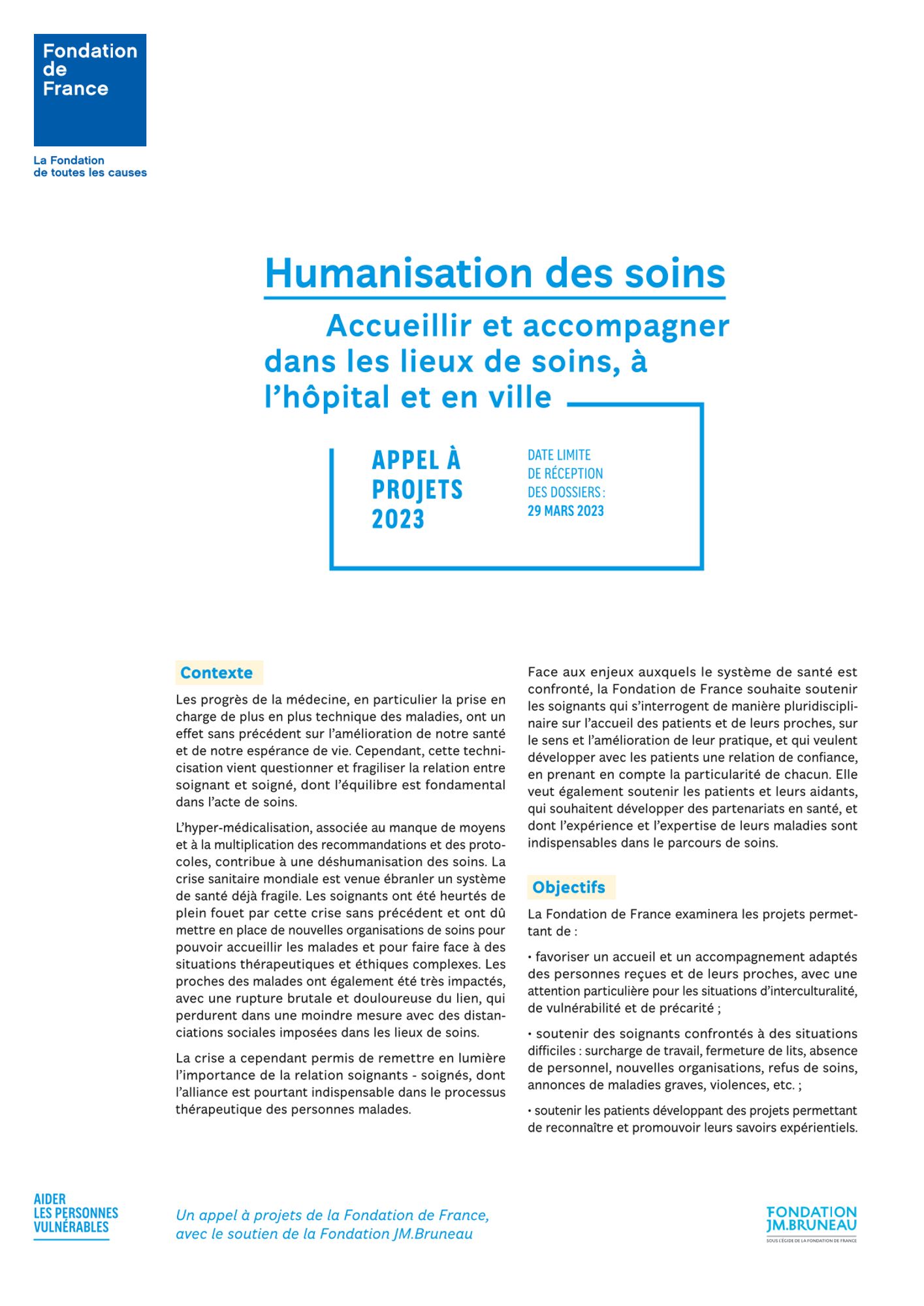 Face aux enjeux auxquels le système de santé est confronté, la Fondation de France souhaite soutenir les soignants qui s’interrogent de manière pluridisciplinaire sur l’accueil des patients et de leurs proches, sur le sens et l’amélioration de leur pratique, et qui veulent développer avec les patients une relation de confiance, en prenant en compte la particularité de chacun. Elle veut également soutenir les patients et leurs aidants, qui souhaitent développer des partenariats en santé, et dont l’expérience et l’expertise de leurs maladies sont indispensables dans le parcours de soins.