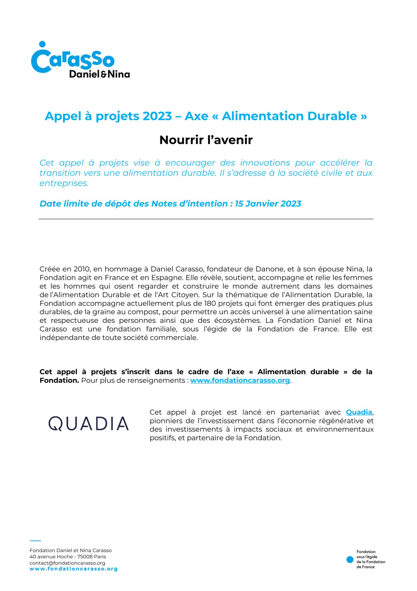 Pour plus de détail, consulter la conformité des projets avec les critères généraux obligatoires de la Fondation (listés dans le document "Faire une demande de financement à la Fondation Daniel et Nina Carasso"), relatifs au fait que le projet se déroule en France, qu'il commence après l'annonce des résultats et sous réserve d'un plafonnement du montant de financement demandé (égal ou inférieur à 50 000 euros pour les associations, entre 100 000 euros pour les entreprises) et de la participation au capital.