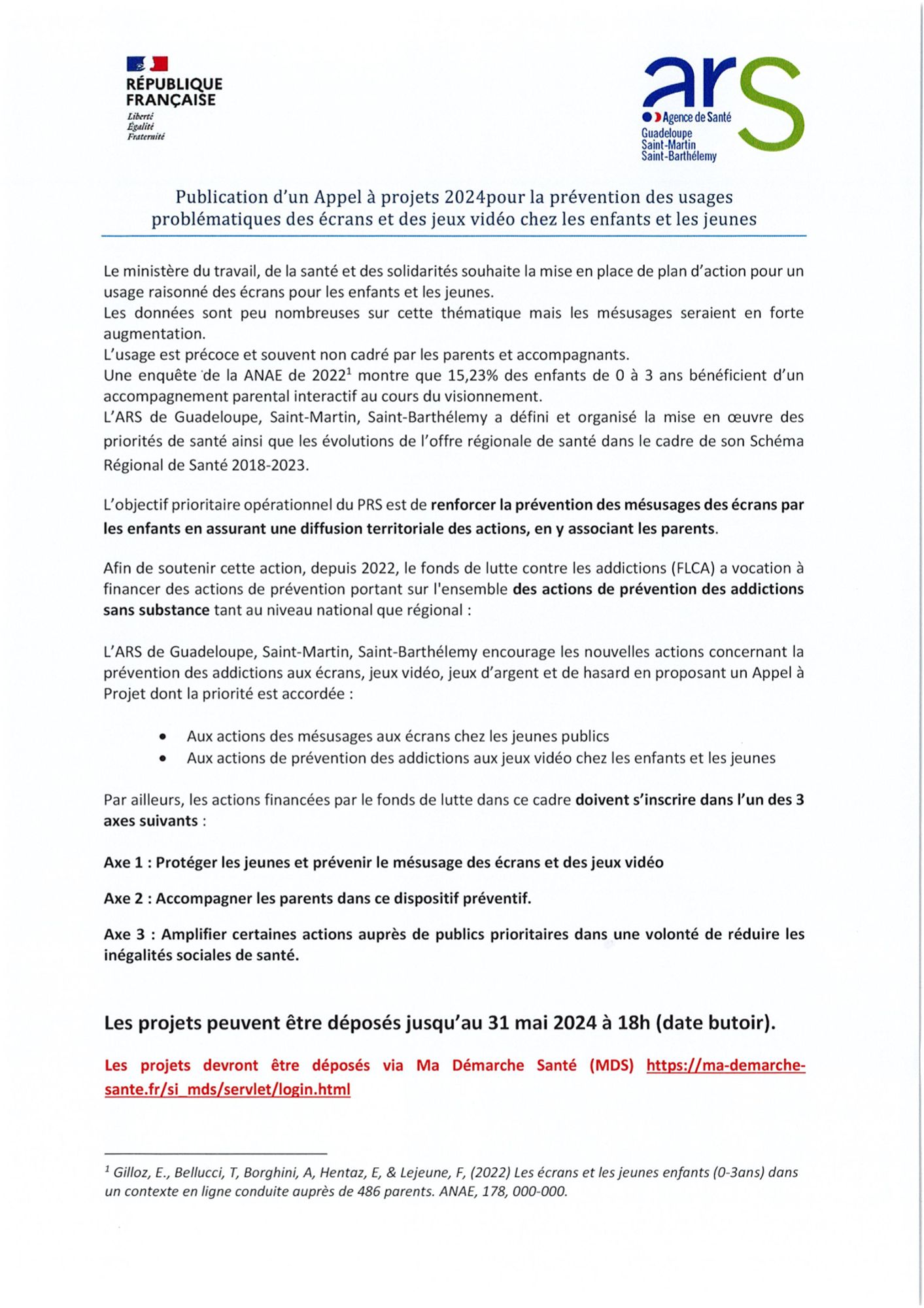 L'ARS de Guadeloupe, Saint-Martin, Saint-Barthélemy encourage les nouvelles actions concernant la prévention des addictions aux écrans, jeux vidéo, jeux d'argent et de hasard en proposant un Appel à Projet dont la priorité est accordée: