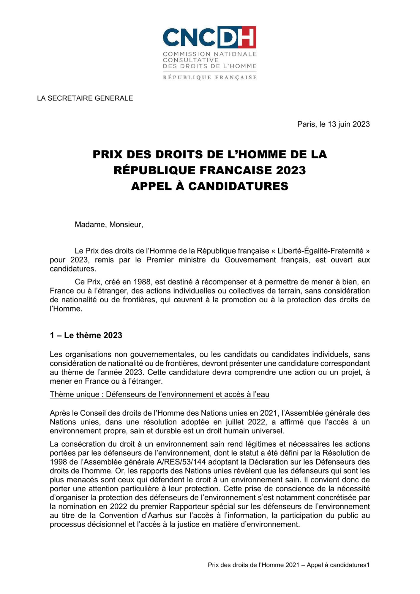 b) le dossier de candidature, joint au présent appel à candidatures, est téléchargeable sur le site de la CNCDH : https://www.cncdh.fr/edition-2023-du-prix-des-droits-de-lhomme