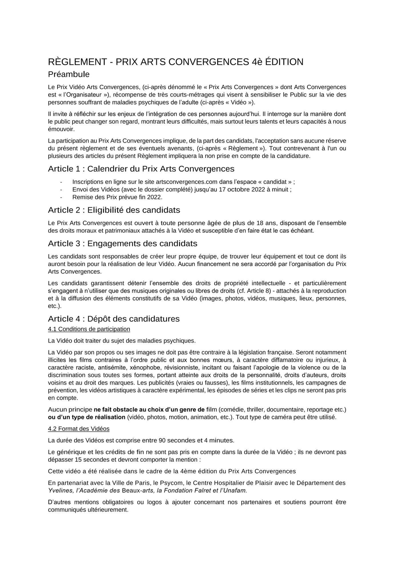 Les candidats sélectionnés cèdent aux Organisateurs du Prix Arts Convergences l'ensemble des droits patrimoniaux accordés aux auteurs et à leurs ayants droits, tels que définis ci-dessous, qu'ils détiennent sur leur Vidéo, pour une durée, de dix ans et pour le monde entier, uniquement pour des exploitations non commerciales.