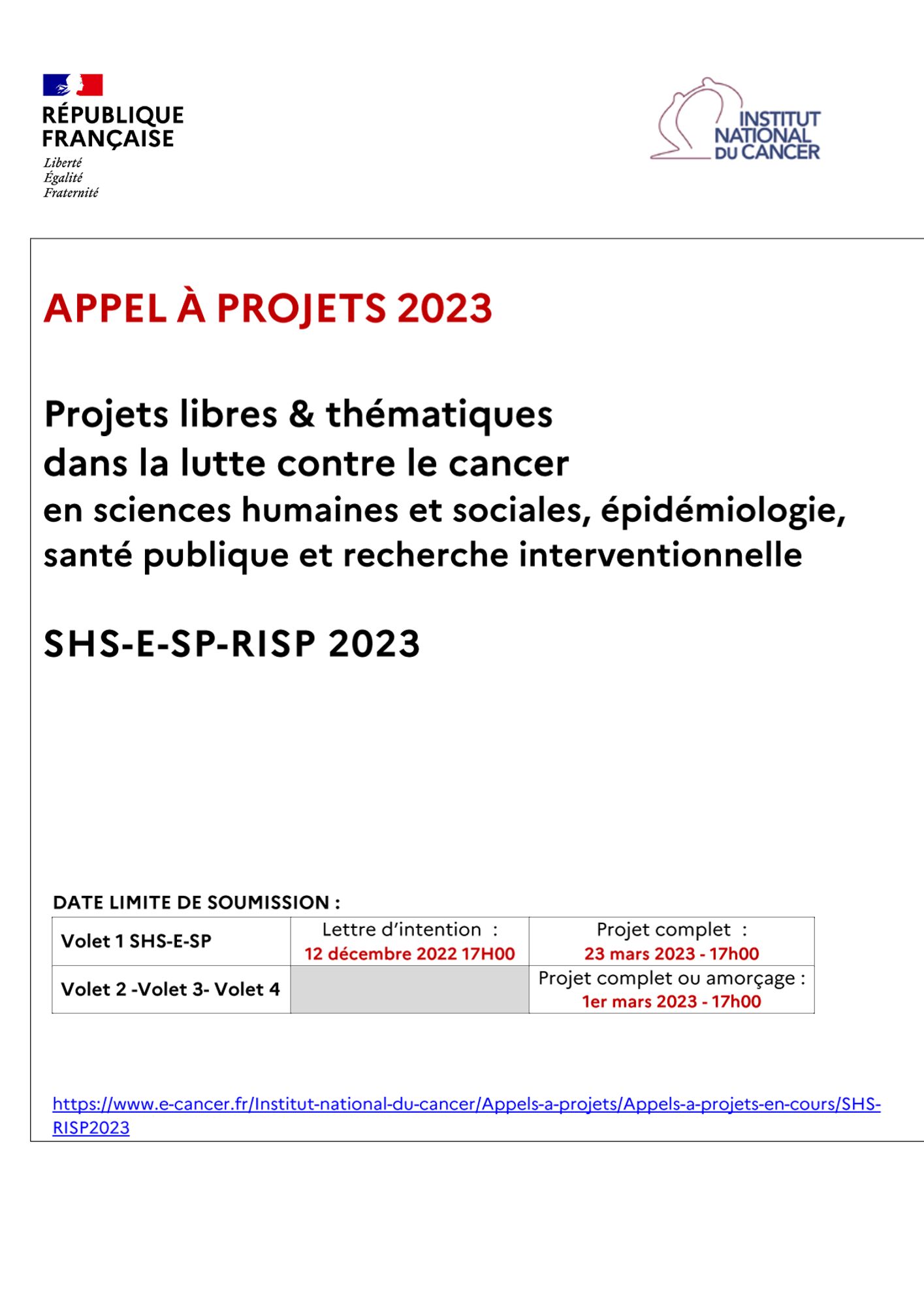 - Soumission projets présélectionné : volet 1 SHS-E-SP: date limite le 23 mars 2023 à 17h00, - volet 2 "libre RISP", volet 3 "thématique SHS-E-SP", volet 4 "thématique RISP" : projet complet ou amorçage 1er mars 2023 - 17h00