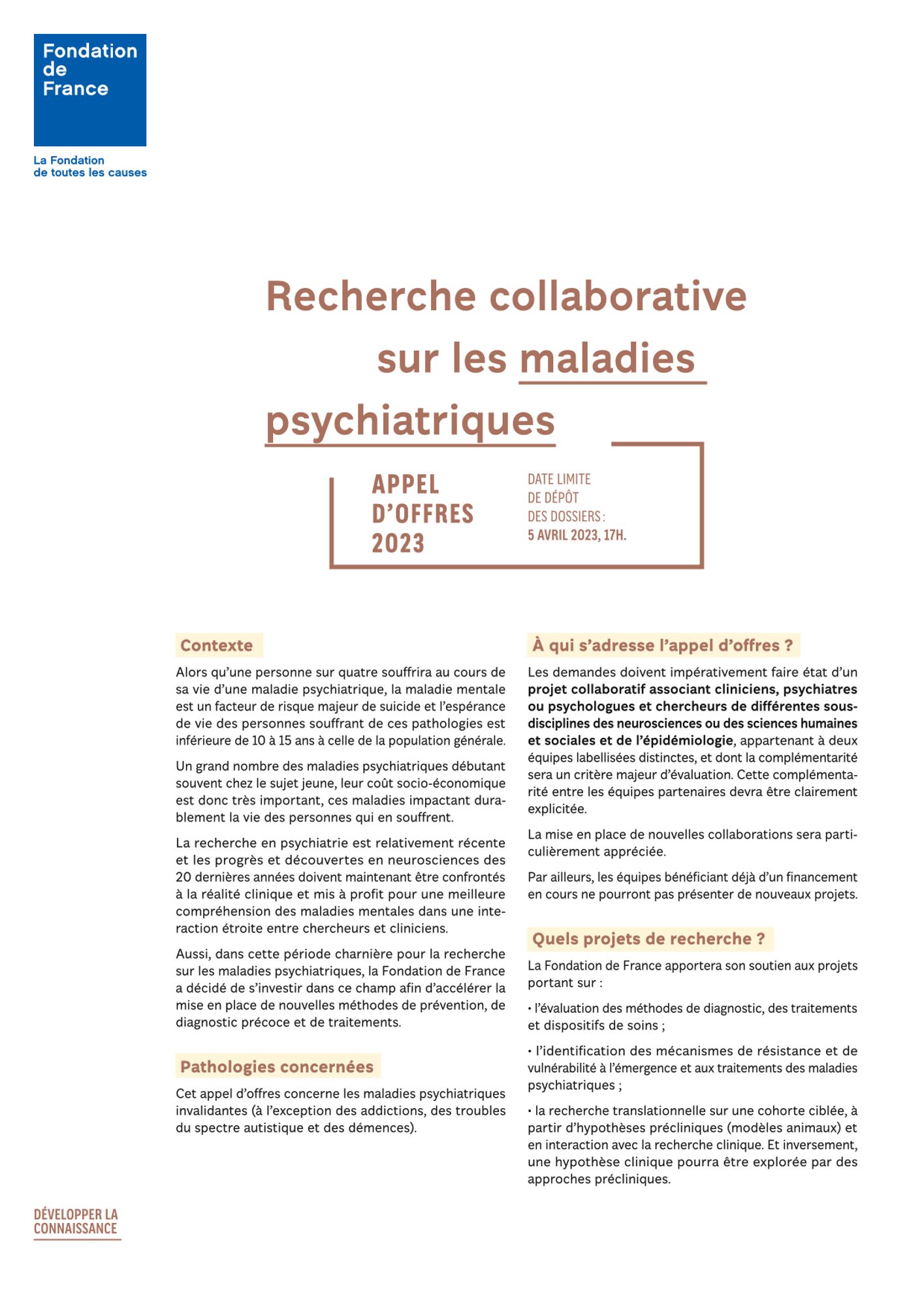 Aussi, dans cette période charnière pour la recherche sur les maladies psychiatriques, la Fondation de France a décidé de s’investir dans ce champ afin d’accélérer la mise en place de nouvelles méthodes de prévention, de diagnostic précoce et de traitements.