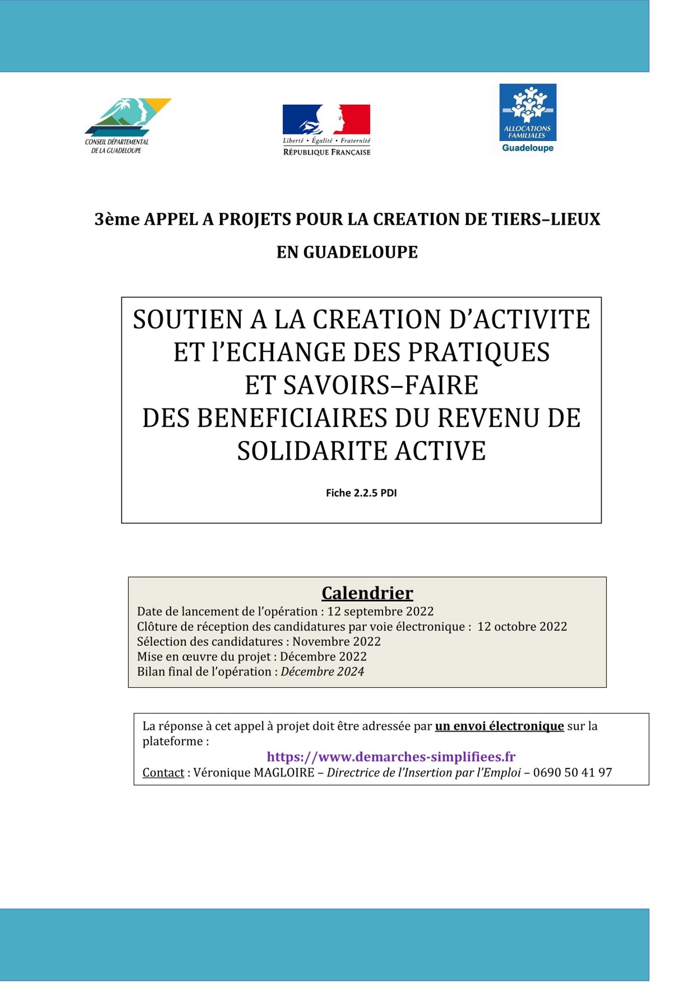 Cet appel à projet doit permettre au Conseil Départemental de la Guadeloupe avec le soutien de l'Etat et de la Caisse d'Allocation Familiales de la Guadeloupe d'identifier et apporter une aide financière aux opérateurs publics ou privés ayant créé ou désireux de créer un tiers-lieu sur le territoire, ouverts aux bénéficiaires du Revenu de Solidarité Active, dans leur reprise d’activité et leur insertion professionnelle (formation, couveuse, bénévolat renforcé et valorisé, valorisation de compétences, tutorat ou toute autre forme…).ces espaces pourront ainsi également solliciter le label Maisons France Service ou l’agrément Centre social délivré par la CAF.