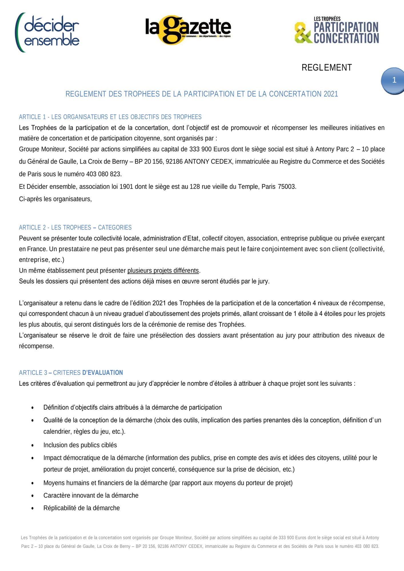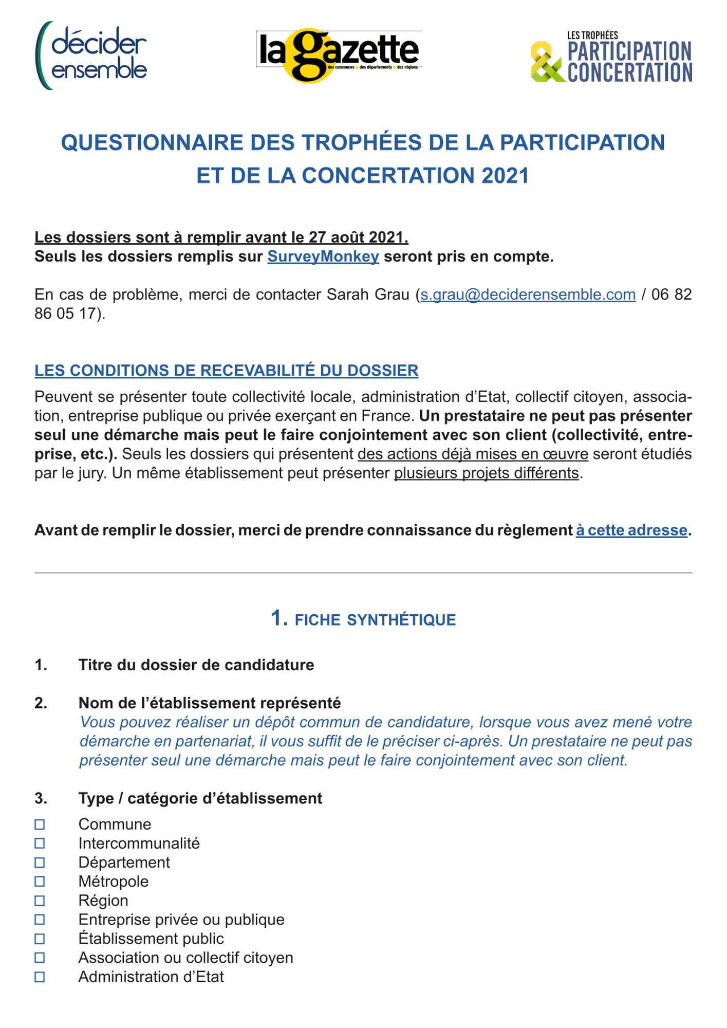 Décider ensemble, en partenariat avec la Gazette des communes, récompense et valorise les démarches participatives innovantes mises en place par les associations, collectifs citoyens, collectivités, administrations ou entreprises à travers ses Trophées de la participation et de la concertation.