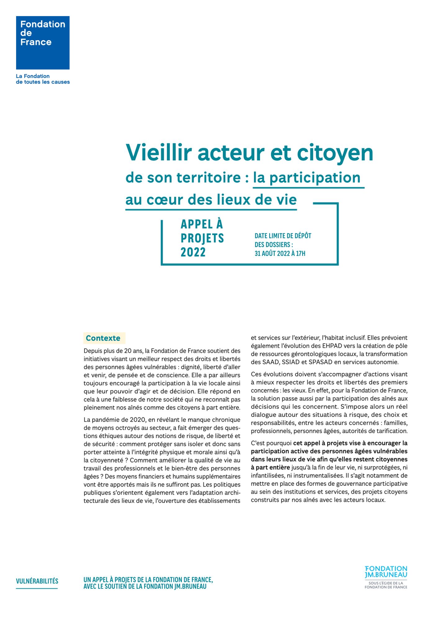 L'appel à projets "Vieillir acteur et citoyen de son territoire : la participation au cœur des lieux de vie" encourage la participation active des personnes âgées vulnérables dans leurs lieux de vie afin qu'elles restent citoyennes à part entière jusqu'à la fin de leur vie, ni surprotégées, ni infantilisées, ni instrumentalisées.