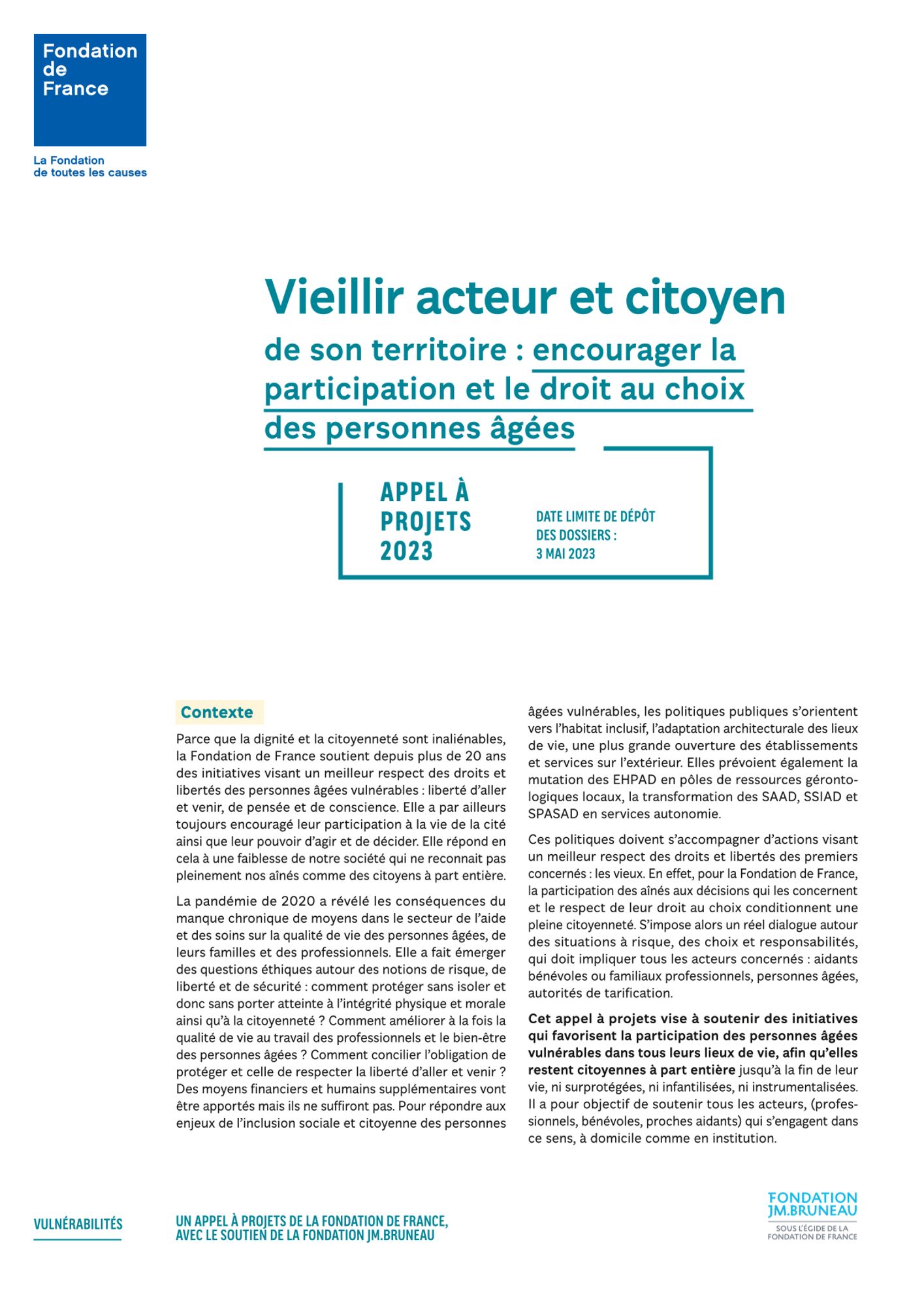 Cet appel à projets vise à soutenir des initiatives qui favorisent la participation des personnes âgées vulnérables dans tous leurs lieux de vie, afin qu’elles restent citoyennes à part entière jusqu’à la fin de leur vie, ni surprotégées, ni infantilisées, ni instrumentalisées. Il a pour objectif de soutenir tous les acteurs, (professionnels, bénévoles, proches aidants) qui s’engagent dans ce sens, à domicile comme en institution.