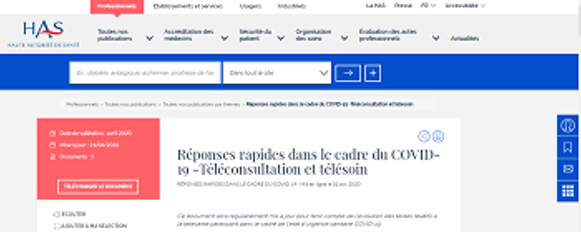 Depuis le début de la crise sanitaire, la Haute Autorité de Santé met à disposition des professionnels des fiches réponses rapides dans le cadre du Covid-19 élaborées en partenariat avec les organisations professionnelles les sociétés savantes et les associations d'usagers.