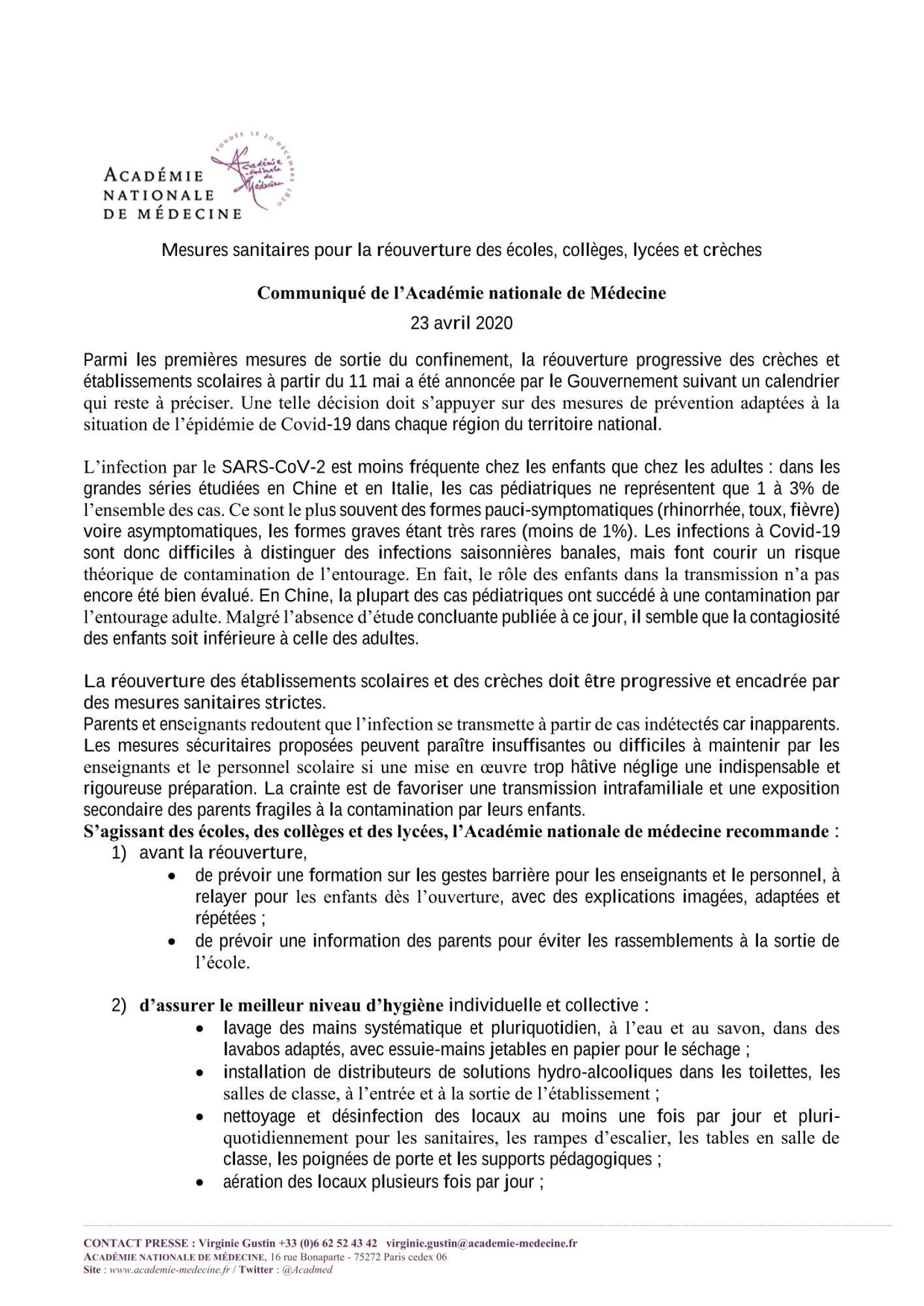 L’Académie nationale de médecine publie une série de recommandations relatives à la réouverture progressive des crèches et établissements scolaires à partir du 11 mai prochain. Elle demande notamment une réouverture progressive et encadrée par des mesures sanitaires strictes.