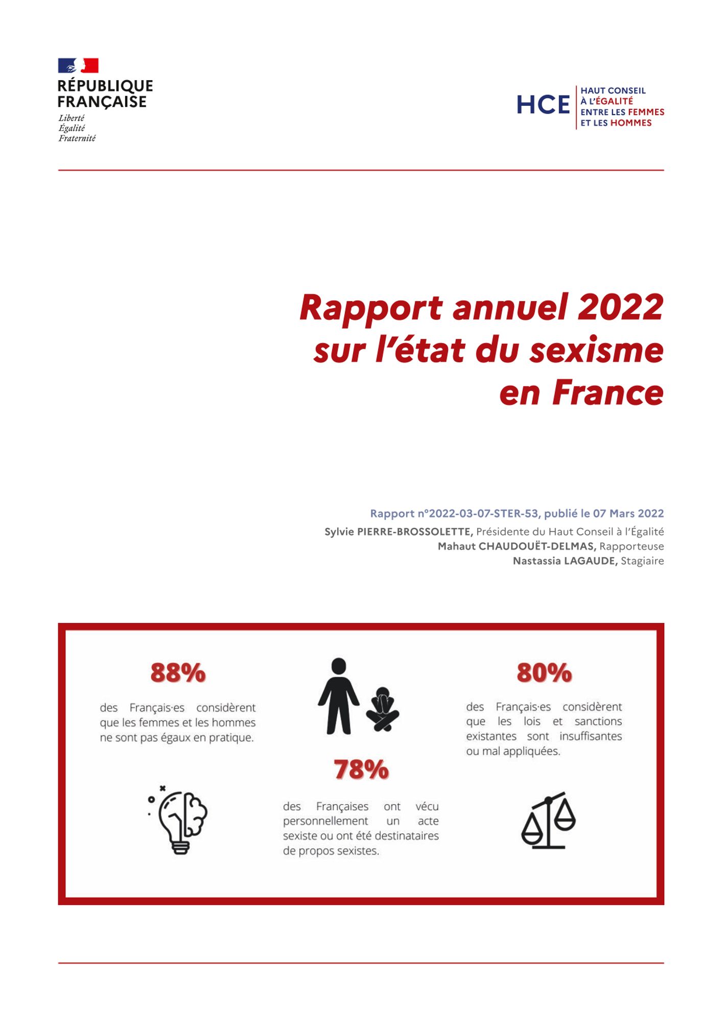 Rapport annuel sur l'état des lieux du sexisme en France en 2022. Haut Conseil à l'Egalité entre les Femmes et les Hommes (HCE), mars 2022