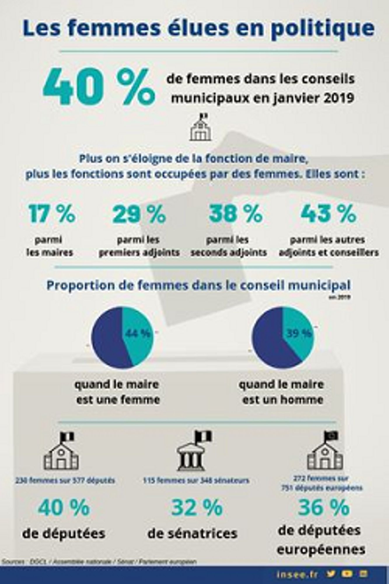 Toutes tailles de communes et toutes fonctions confondues (maire, adjoints, autre conseillers), la part des femmes dans les conseils municipaux en janvier 2019 est de 39,9%. Parmi les communes de moins de 1 000 habitants, pour lesquelles la parité des listes présentées n'est pas obligatoires, cette proportion est inférieure (34,5 %). Plus on s'éloigne de la fonction de maire, plus les fonctions sont occupées par des femmes (...). Plus la commune est grande, plus c'est un homme qui la dirige, mais plus il ya de femmes parmi les autres membres du conseil. Les disparités géographiques sont faibles. Il y a un peu moins de femmes dans les conseils municipaux des communes du nord et de l'est du pays et en Corse, et un peu plus en Bretagne sur la côté atlantique et sur la côte méditerranéenne. A partir de 40 ans, la proportion de femmes diminue avec l'âge des conseillers municipaux.